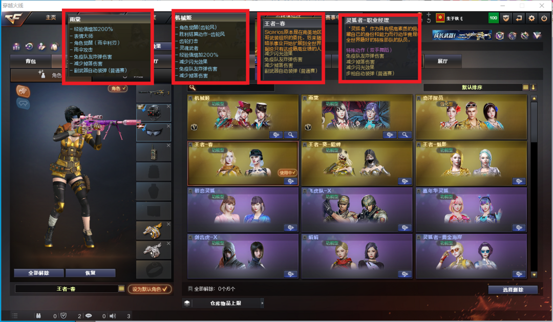 装备描述:排位:可以、、、、、、、、爆破全装:幻神4皮肤+音效(宠儿、N9、巅峰荣耀、CFS2022)、王者星神、、、USP雷暴、COP云龙、、、、传说光耀、QBZ金色蔷薇、王者白虎、炽芒蝶刃、、、幻神音效、蔷薇音效、、、1套雷霆、5套雷暴、1套堕天神、1套夜魔、、、、爆破四防(雨棠、王者貂蝉、机械姬、王者春、王者魅影)