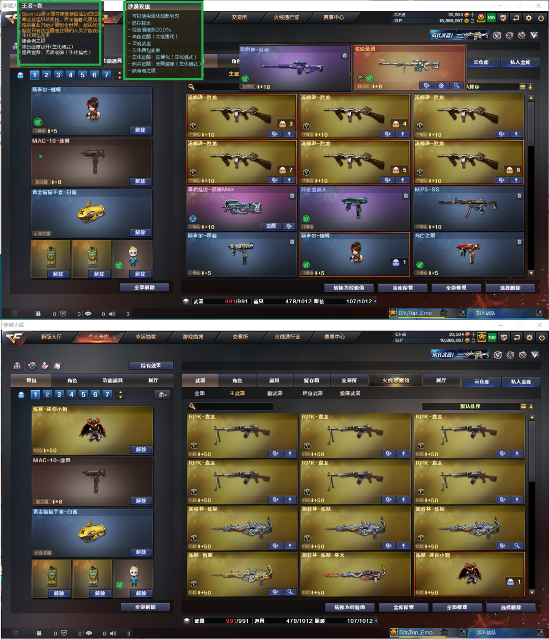 装备描述:排位:可以--------------------生化四防(可以变更背包、查看生化僵尸血量):无需换弹、6烈6盘、炼狱小钢、斯泰尔蝴蝶、异变清道夫、死亡之眼、传说圣灵、MAC涂鸦、手斧镜、2个生化减速雷、超级对讲机、生化常用弹匣、、、、、、、爆破四防:幻神3皮+音效(宠儿、冠军之幻、黄忠皮肤)、98K星神、幻神竞技荣光、王者幻神、、、、、USP雷暴、2个COP堕天神、2个COP幻灵、2个柯尔特竞技荣光、4个世冠柯尔特、COP雷霆王者、传说光耀、传说暗裔、白虎、QBZ天罚、QBZ金色蔷薇、王者白虎、王者蔷薇、、、幻神音效、裁决音效、蔷薇音效、白虎音效、雷神音效、毁灭音效、黑龙音效、极光音效、火麒麟音效、黑骑士音效、、、5套雷暴、7套堕天神、7套夜魔、7套电竞装甲、3套幻灵、8套竞技荣光、5套雷霆王者、5套王者之魄、、、生化四防(沙漠玫瑰、王者春)爆破四防(传说女帝、云悠悠、王者貂蝉、王者魅影、王者小乔、王者涂鸦、职业经理)