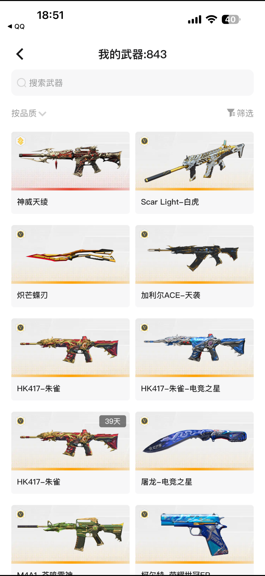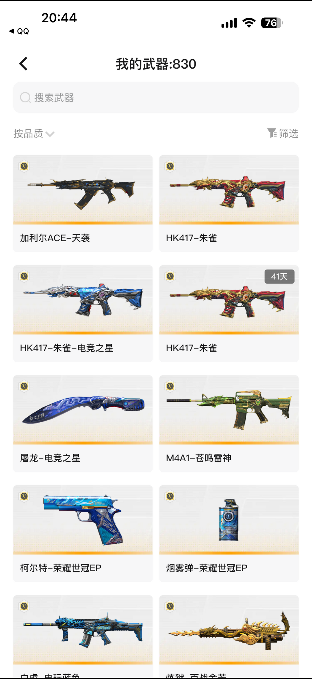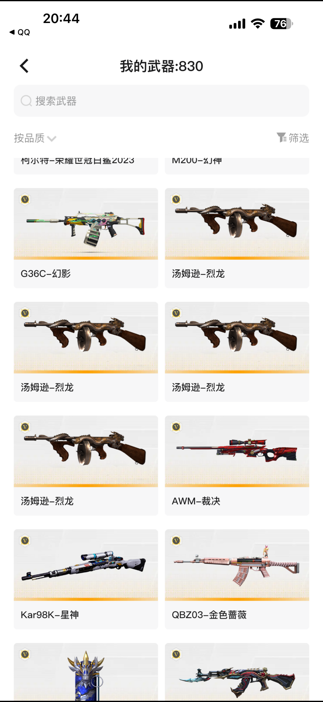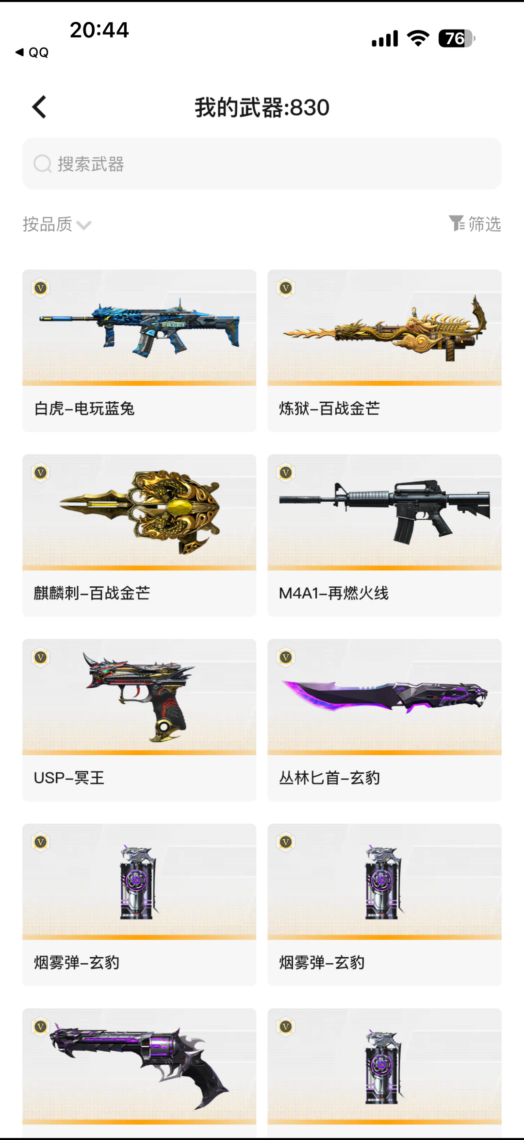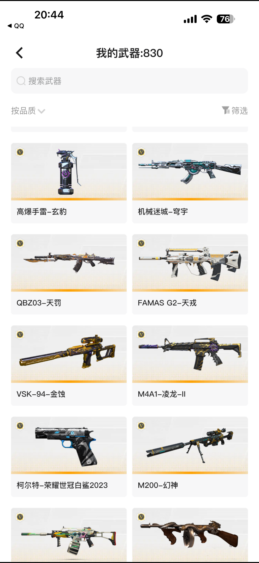 装备描述:王者武器:烟雾弹-雷暴王者;高爆手雷-雷暴王者;闪光弹-雷暴王者;王者之怒-觉醒版;王者之锋-觉醒版;王者之啸;王者之光;王者之心;王者之势;王者之魄 英雄武器:加利尔ACE-天袭;HK417-朱雀;HK417-朱雀;白虎-电玩蓝兔;USP-冥王;丛林匕首-玄豹;烟雾弹-玄豹;Anaconda-玄豹;闪光弹-玄豹;高爆手雷-玄豹;机械迷城-穹宇;QBZ03-天罚;FAMAS G2-天戎;柯尔特-荣耀世冠白鲨2023;M200-幻神;G36C-幻影;汤姆逊-烈龙;AWM-裁决;Kar98K-星神;QBZ03-金色蔷薇;闪光弹-云龙;无影-神兵利器;AK47-火麒麟;高爆手雷-竞技荣光;闪光弹-竞技荣光;烟雾弹-竞技荣光;擎天-竞技荣光;M200-竞技荣光;柯尔特-竞技荣光;斩神刀-雷暴;高爆手雷-雷暴;烟雾弹-雷暴;闪光弹-雷暴;龙啸;AK47-黑鲨;加特林-炼狱;沙鹰-修罗;AWM-天龙;AK47-黑武士;M4A1-死神;Barrett-极光;M4A1-玫瑰精灵;M4A1-雷神;沙鹰-幻兽;烟雾弹-幻兽;闪光弹-幻兽;高爆手雷-幻兽;破空枪刃;QBZ95-幻兽;女皇利刃-幻兽;AK47