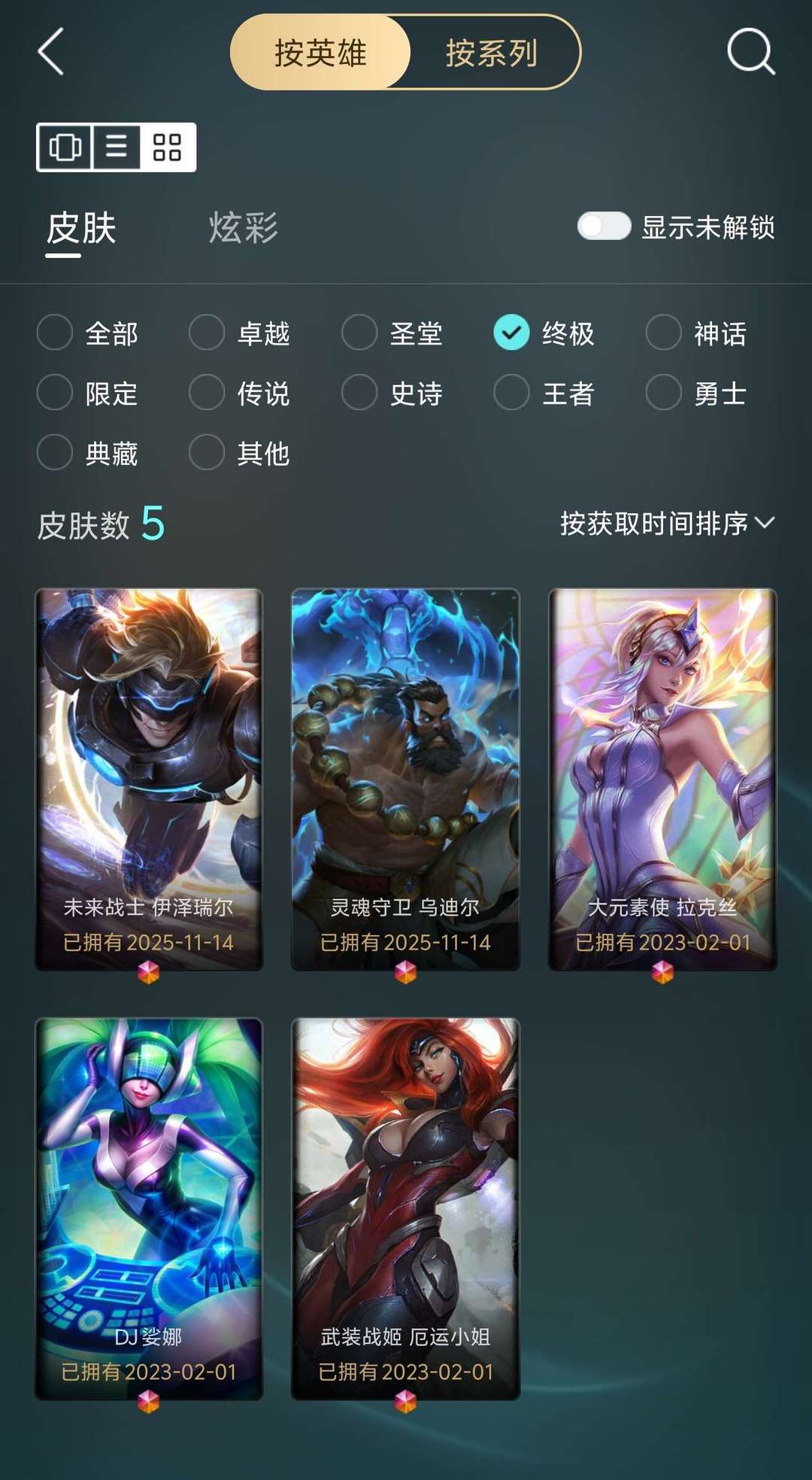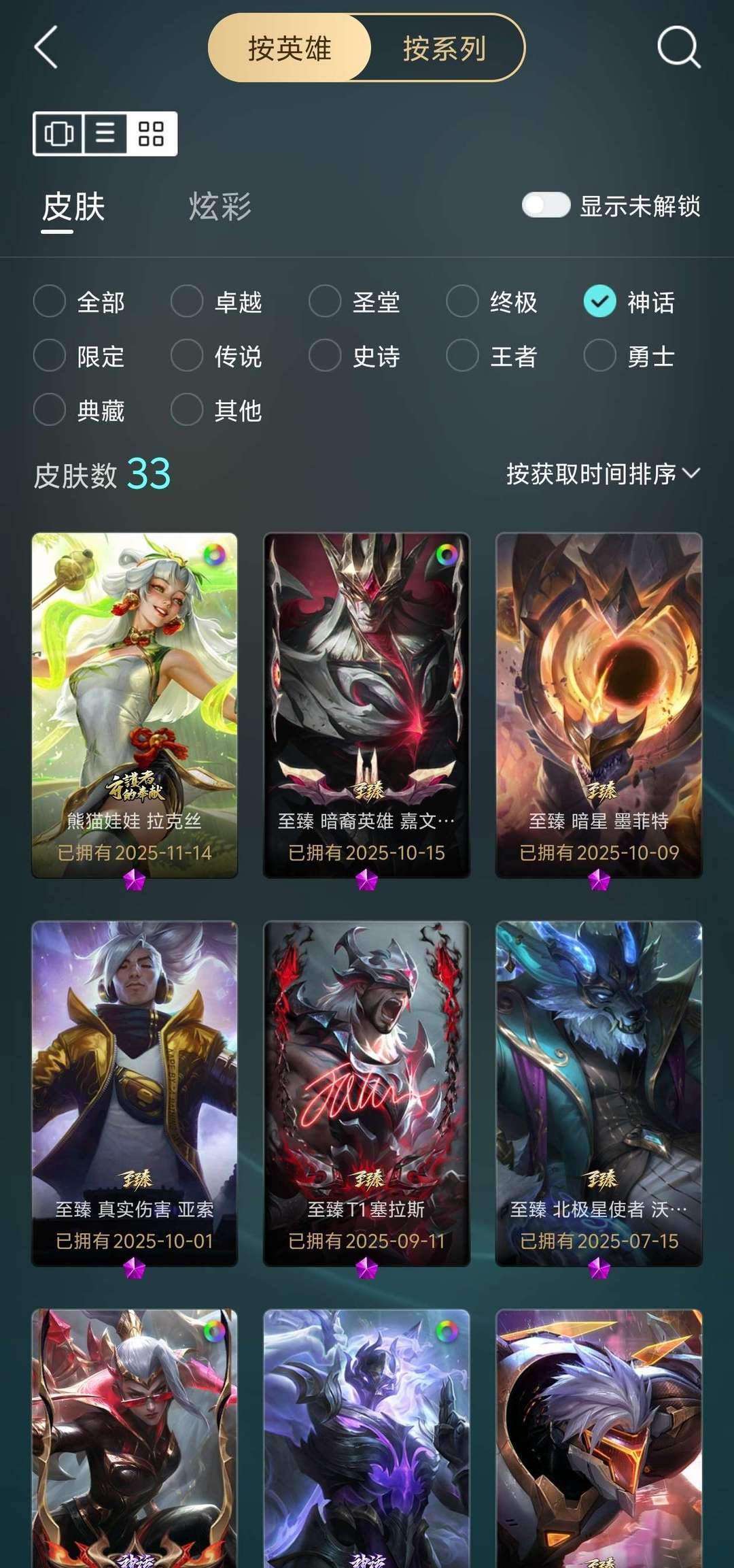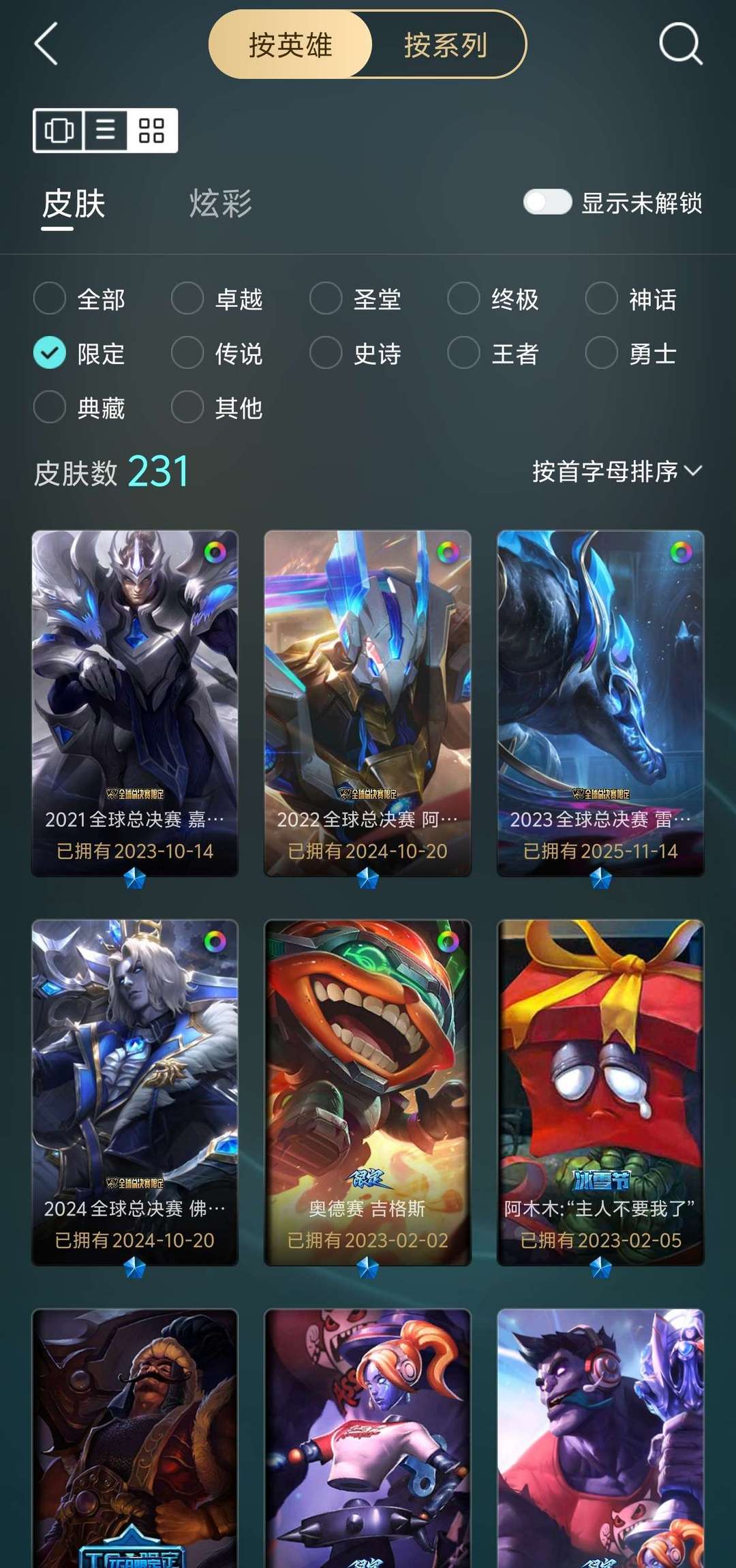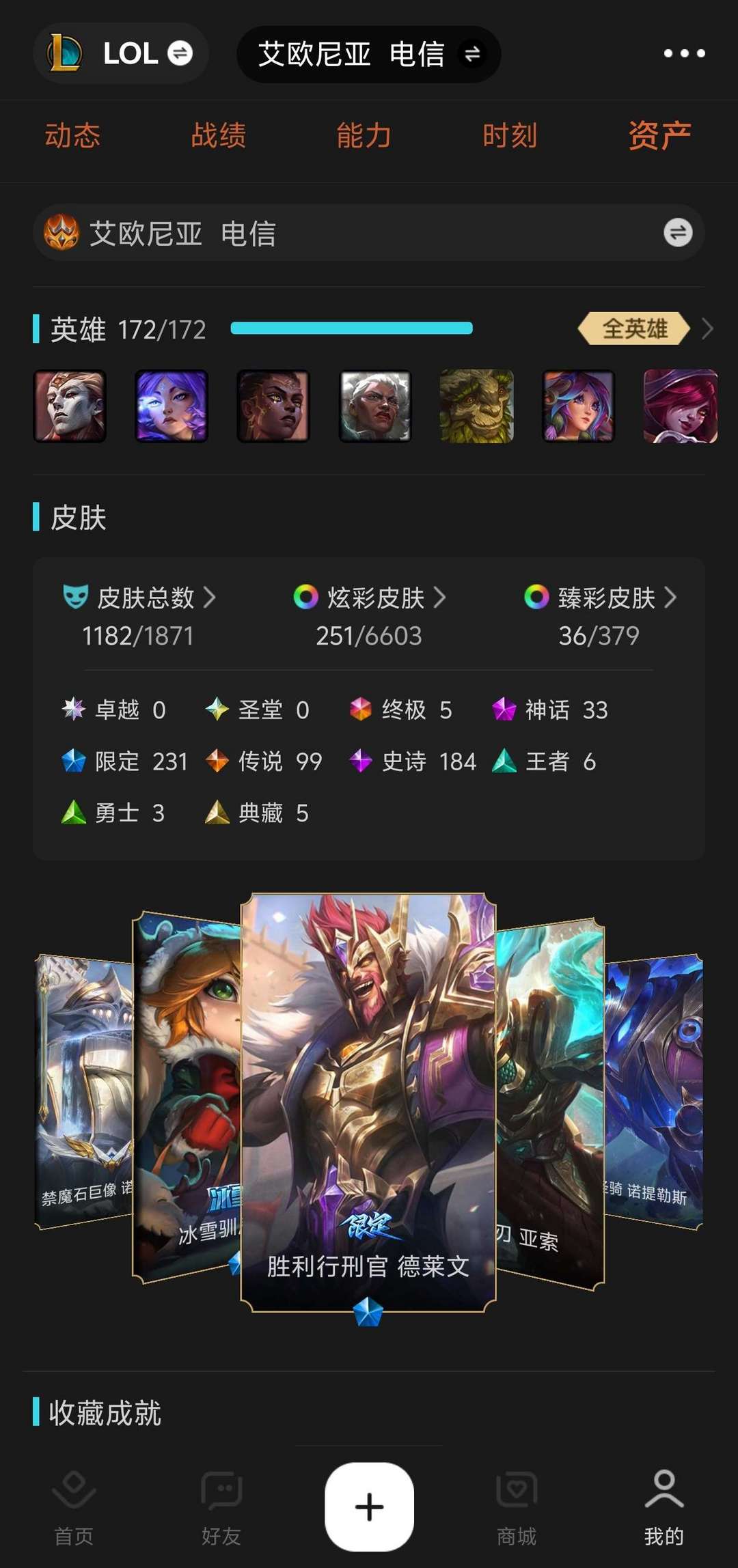 有1182个皮肤,其中包含5款终极皮肤,33款神话皮肤,99款传说皮肤,231款限定皮肤等……