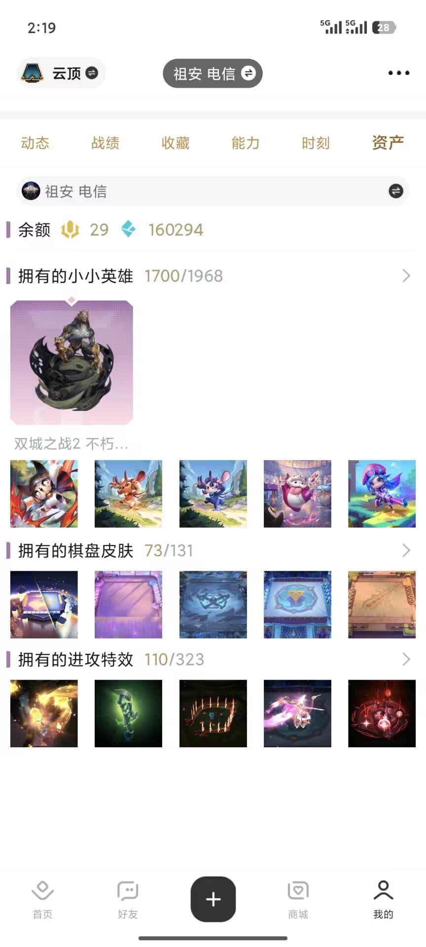 装备描述:祖安超级号,1856原皮,双签名阿狸跟卡莎,全圣堂,全神话幻想,全神话,限定差11张全满。284张臻彩,2164张炫彩。也可下棋,近两年云顶新出的都拉满。1700个小小英雄,73张棋盘,110个进攻特效。冻结可协助解除,全天24在线