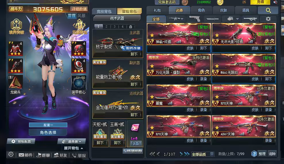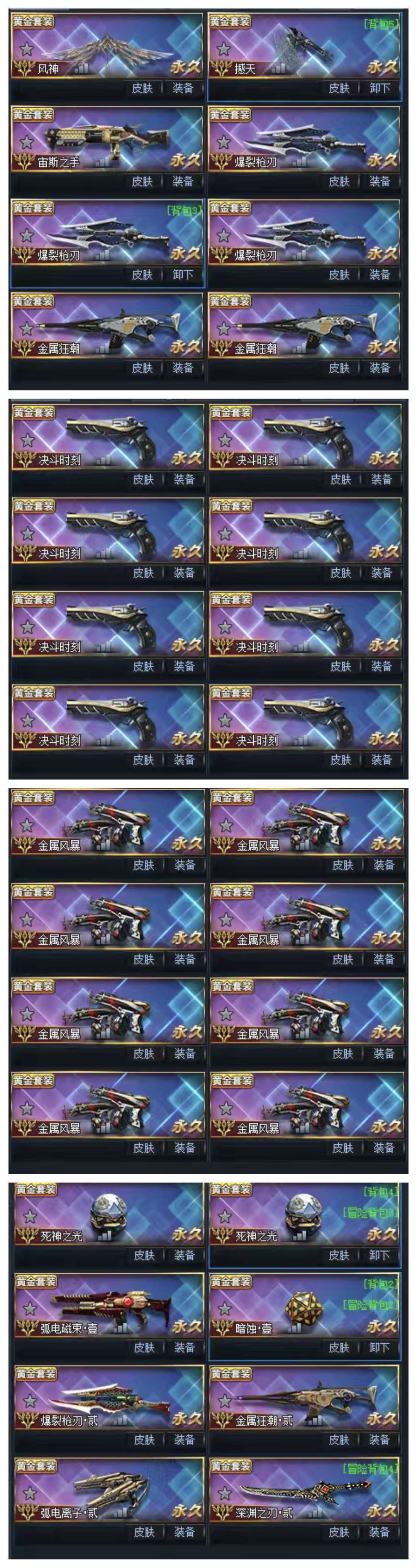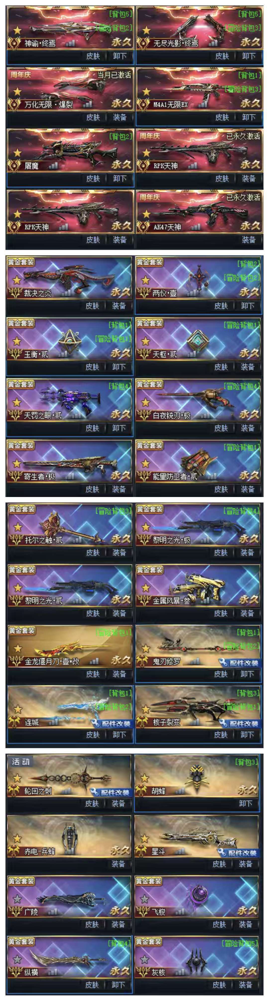装备描述:热门武器:幻宇星涡,AK47天神,连城,风神,飞梭,塞壬,神谕,RPK天神,屠魔血魔,无尽光影终焉,M4A1无限EX|8传说