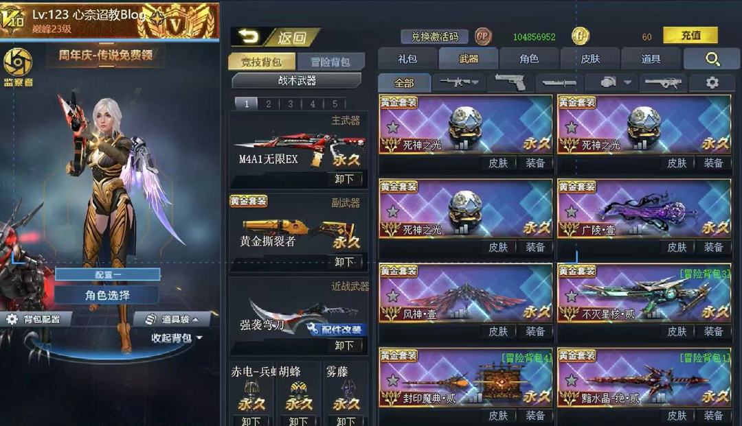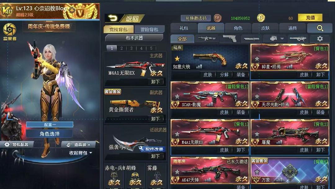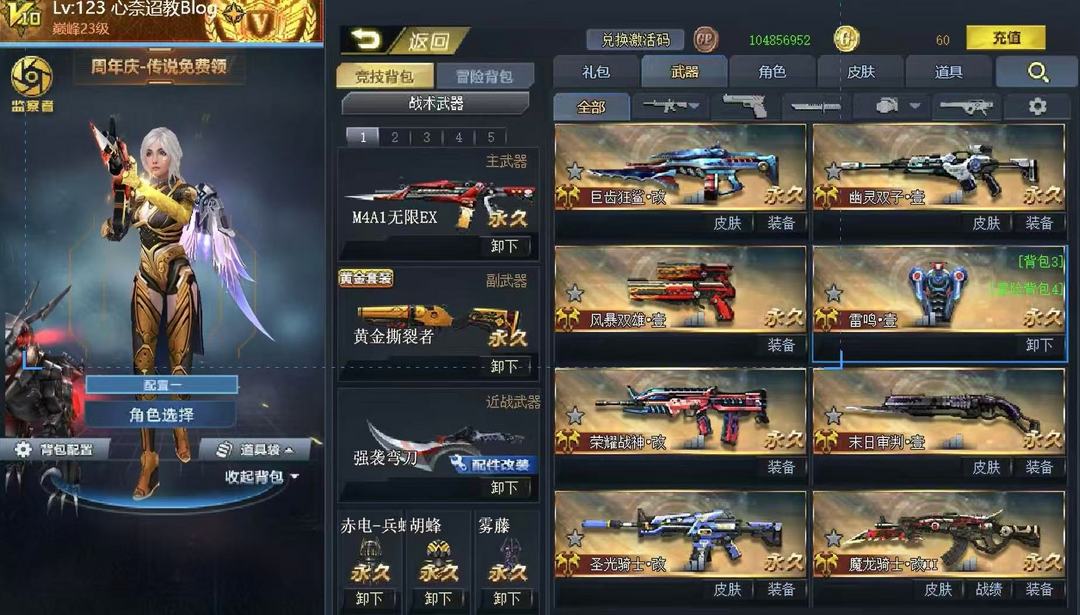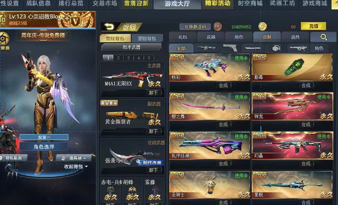 装备描述:有母体潘多拉+无限ex+屠魔+影魔+终焉+天神+各类竞技武器+没人租可以继续玩