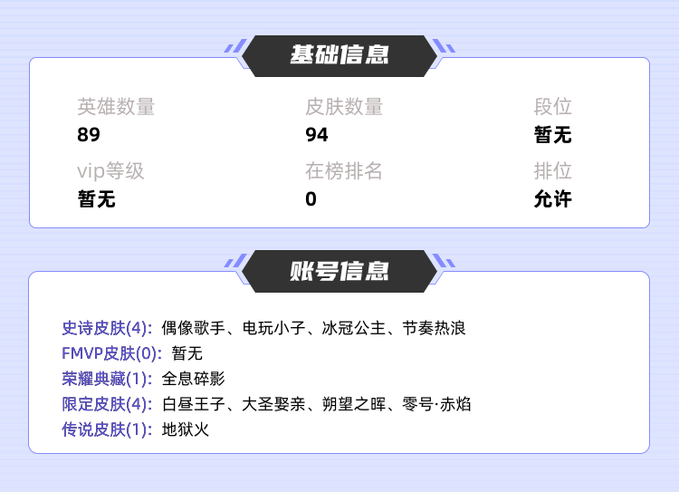 限制: 撤单率<100%才可租用此帐号装备描述:>>>>>>毁号,涉及毁坏虚拟财产罪及计算机安全罪,请文明游戏素质游戏,让我们共建美好租号平台>>>>>> 本游戏账号: ,英雄虽然少,应该有你喜欢的英雄。,皮肤多。典藏皮肤1个,感受典藏皮肤带来的优质体验快感, 私人所属英雄皮肤有:孙悟空 全息碎影孙悟空 地狱火女娲 朔望之晖||嬴政 白昼王子||孙悟空 大圣娶亲||孙悟空 零号·赤焰王昭君 偶像歌手||阿轲 节奏热浪||雅典娜 冰冠公主||鲁班七号 电玩小子,等等 注意事项: A.游戏过程中请不要恶意挂机或者不文明发言;B.恶意挂机、顶号等行为将被拉黑无法再次下单;C.进入游戏后中途请勿退出登陆,否则无法再次上号;D.部分账号由于异地登录可能会出现密码错误提示,通常再尝试5-6次后可上号。 |||||||||>喜欢本账号请点 ☆收藏☆ 方便下次租用,谢谢光临惠顾|||||||||