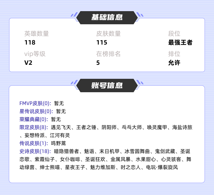装备描述:>>>>>>毁号,涉及毁坏虚拟财产罪及计算机安全罪,请文明游戏素质游戏,让我们共建美好租号平台>>>>>> 本游戏账号: ,英雄多,皮肤多。 私人所属英雄皮肤有:李元芳 妄想特派||钟无艳 王者之锤||狄仁杰 阴阳师||桑启 海盐诗旅||阿古朵 江河有灵蝉 圣诞恋歌||甄姬 冰雪圆舞曲||墨子 金属风暴||孙尚香 水果甜心||刘禅 电玩·爆裂旋风||妲己 魅力维加斯||吕布 末日机甲||吕布 圣诞狂欢等等 只要不毁号掉信誉积分用物品乱发言就行。