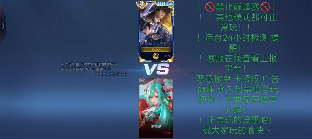 限制: 租号3次及以上 |装备描述:店铺内大多数号均可低价包天喔 本周截图❤️ 恶意挂机撤单永久拉黑平台记录 禁止巅峰赛● ★开挂美化包等违规第三方软件导致封号将会平台申诉封其租号玩账号并追究其法律责任 ★恶意撤秒改密码顶号拉黑并申诉追回租金 喜欢此账号租号玩平台直接租赁即可 ●以下违规情况扣除保证金①该账号禁止改名 ②违规导致扣信誉积分③非法发言导致账号禁言④聊天记录出现诈骗记录⑤禁止巅峰赛 打巅峰拉黑 租号玩管理员将24小时通过后台监控!