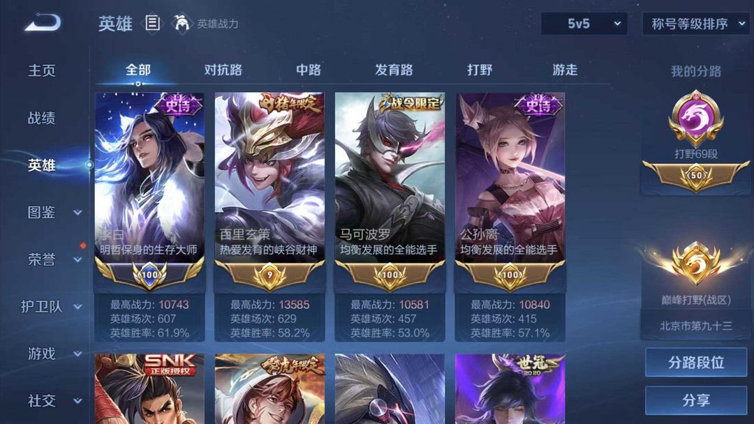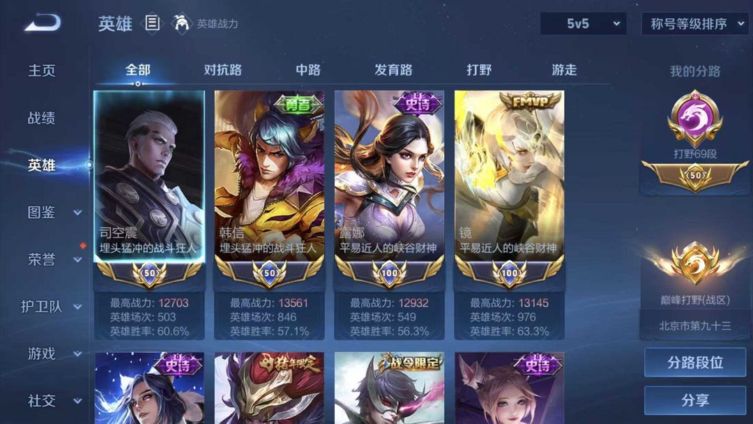69段打野⭐历史小国标镜小国标露娜小国标李白韩信司空震⭐打野绝活哥男神号⭐巅峰已开⭐带妹必备