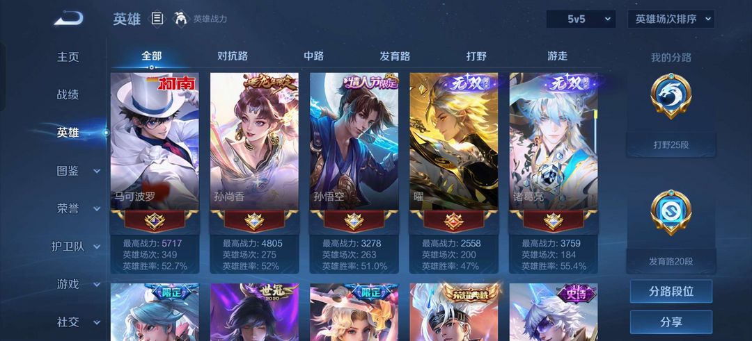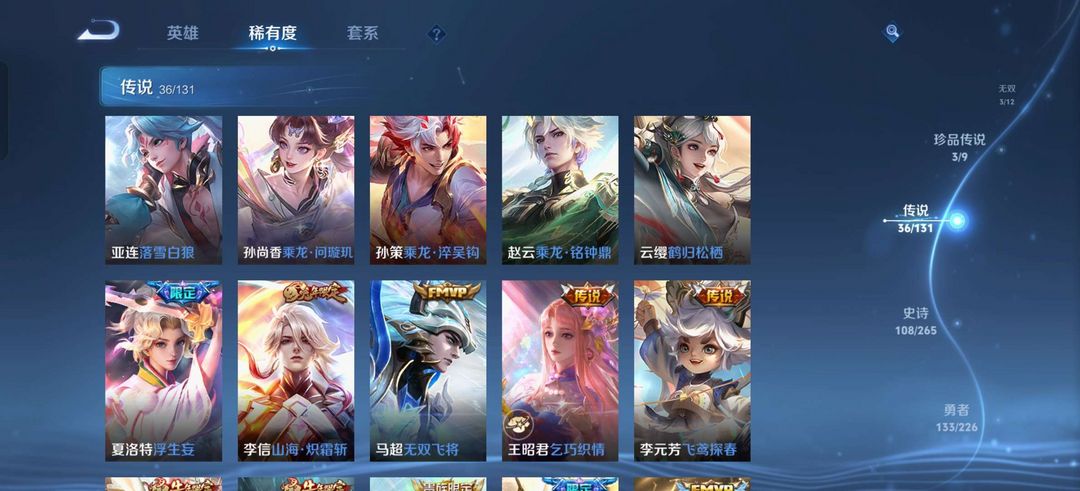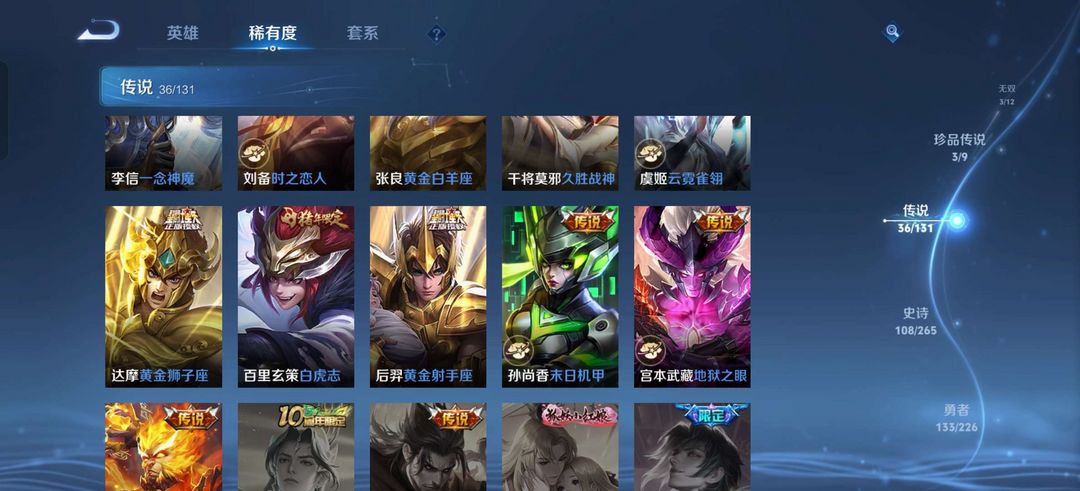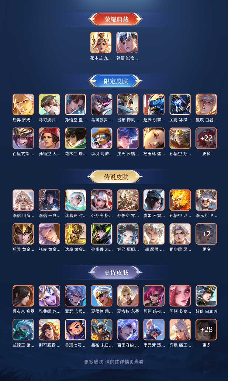 装备描述:韩信铠木兰典藏 李白诸葛曜无双 至尊宝 怪盗基德 未来机甲 猴子双星传说 一套龙年限定 白虎志 满级铭文 王者段位