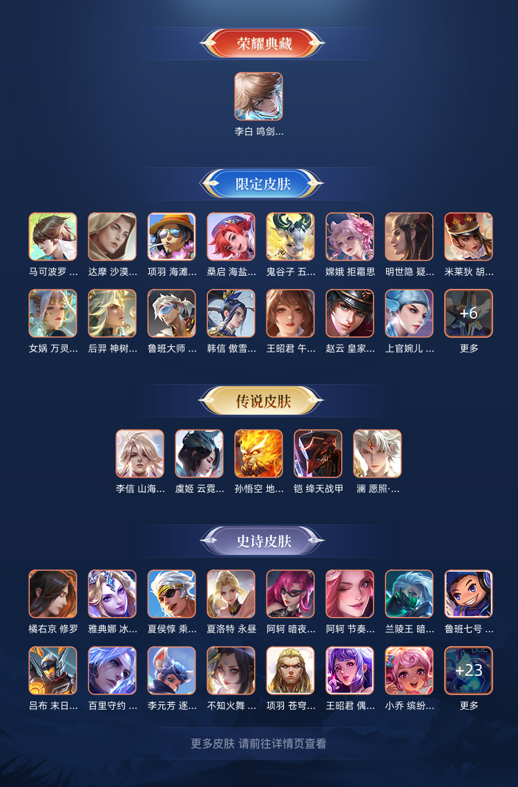 多皮肤,凯,李信,夏洛特等英雄传说限定皮肤,李白荣耀典藏等等,众多史诗品质皮肤