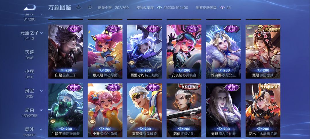 v7李白典藏5传说限定53史诗两百多个皮肤