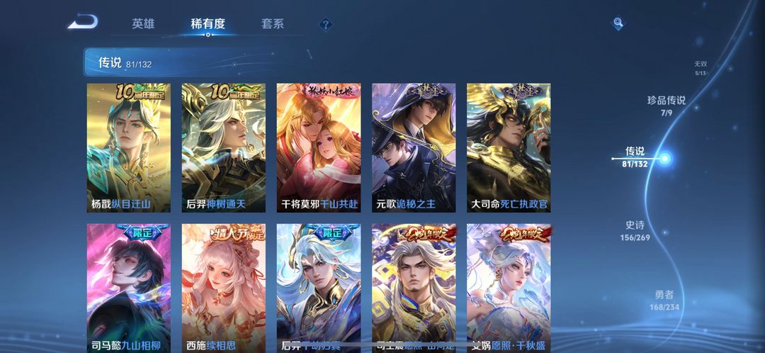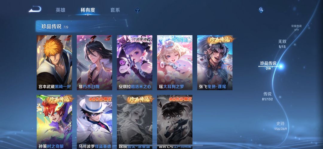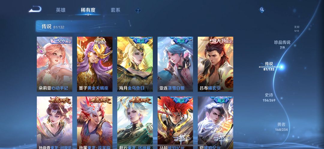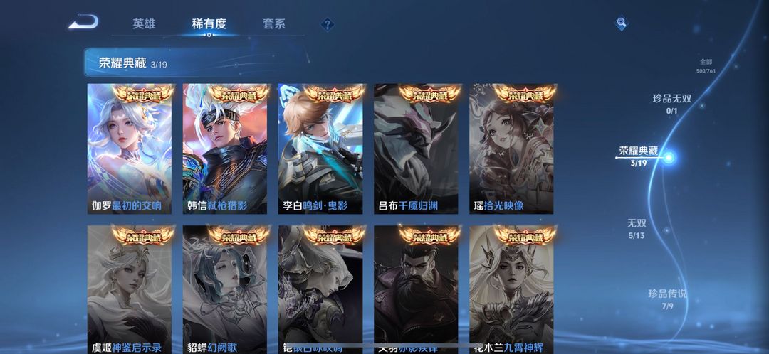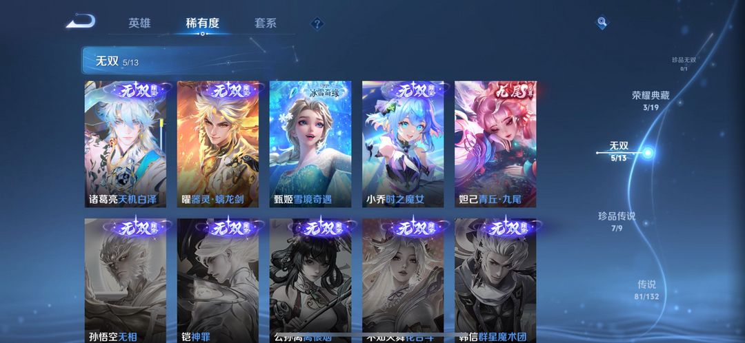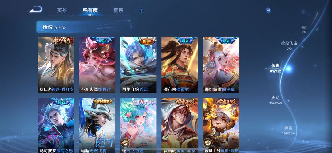 伽罗最新典藏-5个无双皮-7个珍品传说-81个传说皮全套满级铭文 全英雄熟练度可排位