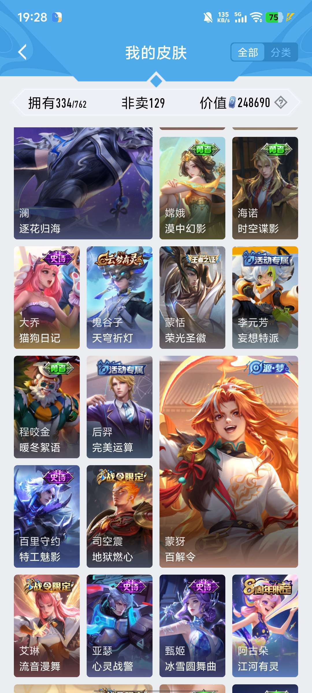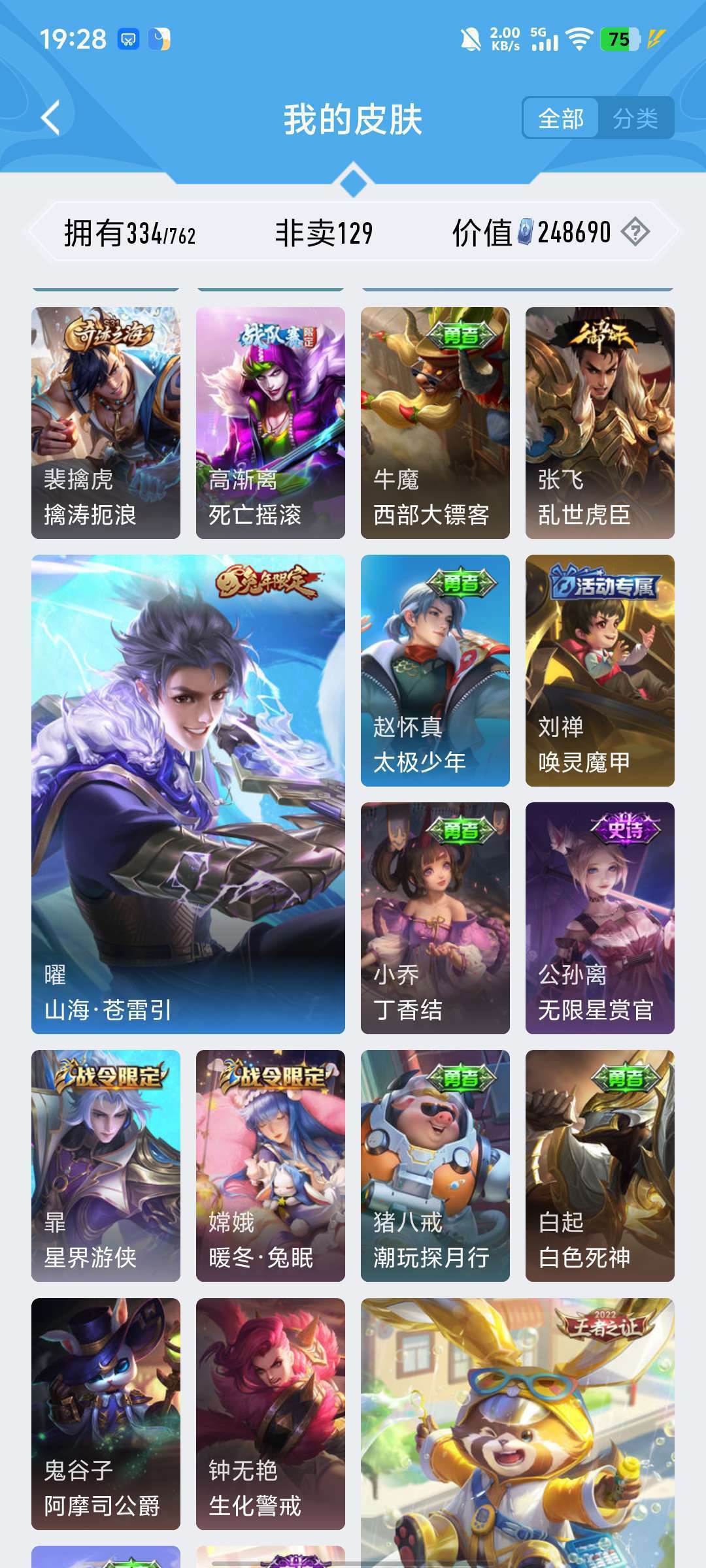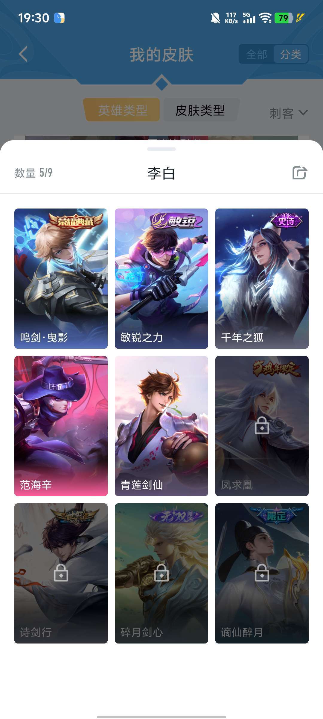 李白的荣耀典藏,雅典娜的神奇女侠,耀的李逍遥,韩信的飞衡,露娜的限定皮肤,猴子的机甲皮肤和至尊宝