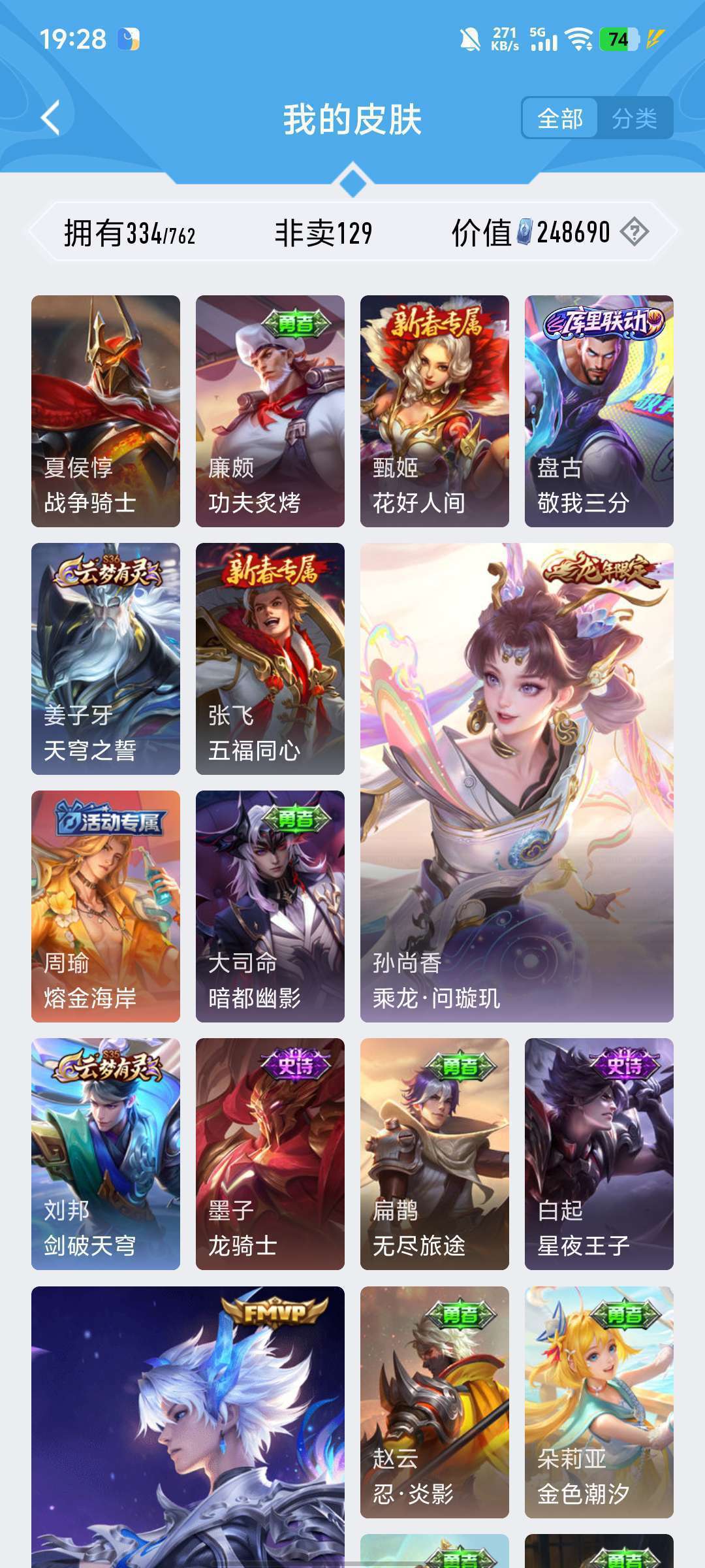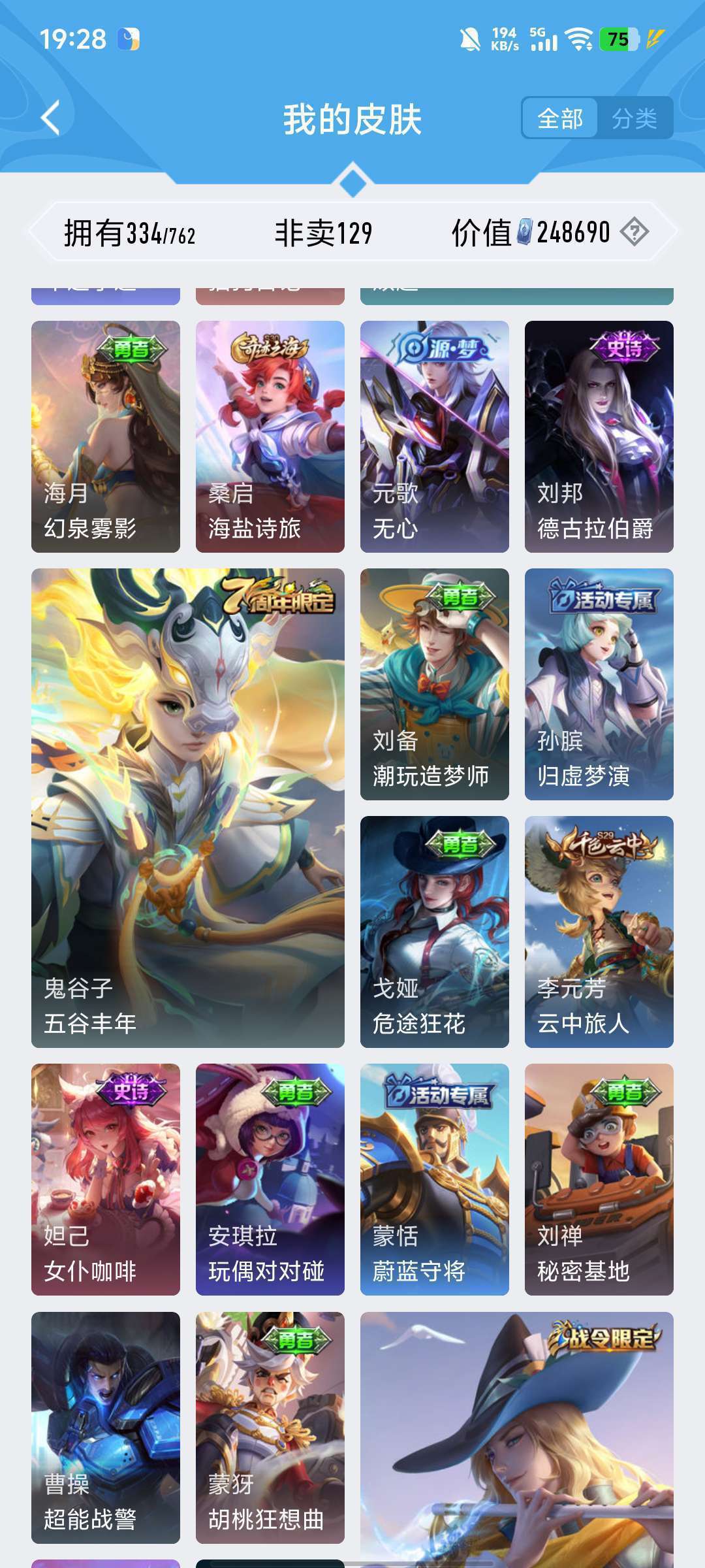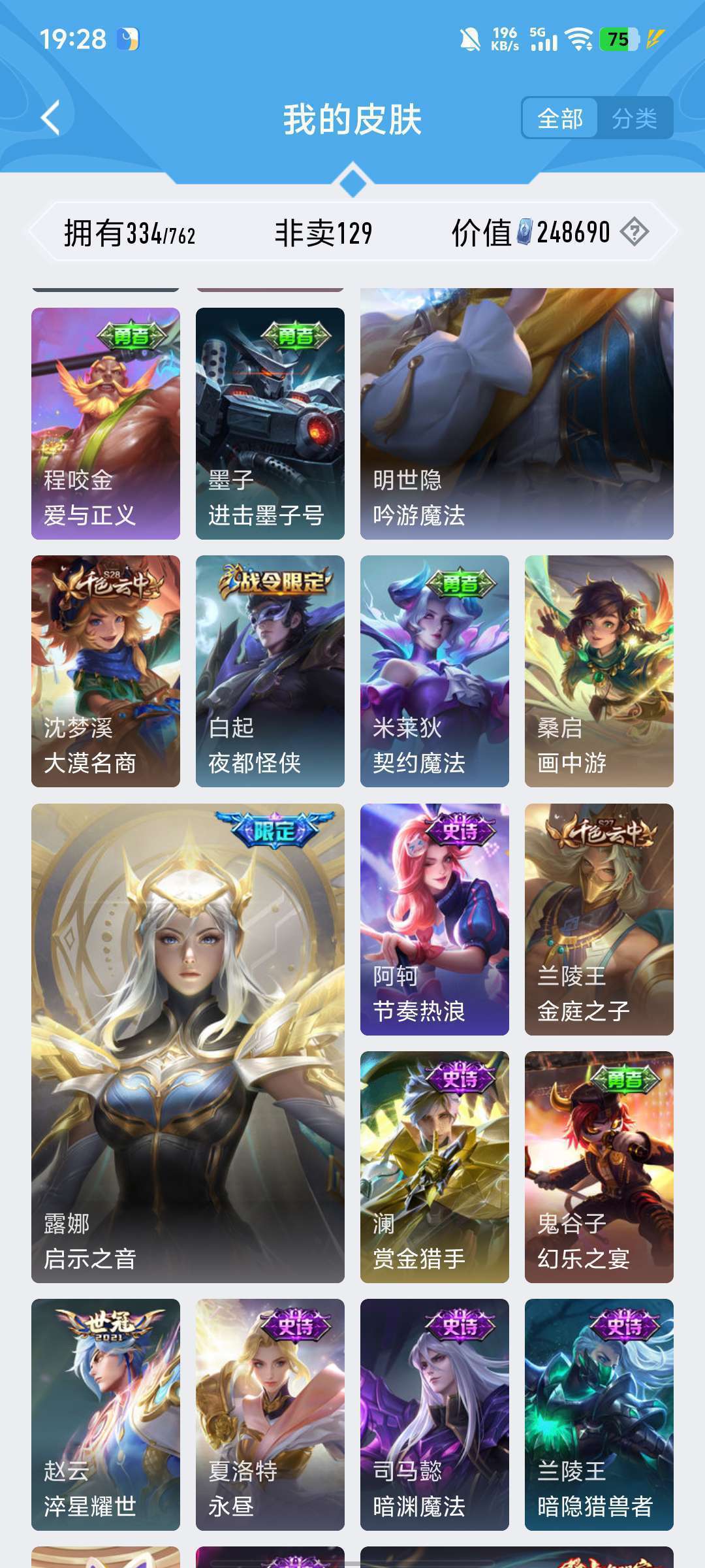 李白的荣耀典藏,雅典娜的神奇女侠,耀的李逍遥,韩信的飞衡,露娜的限定皮肤,猴子的机甲皮肤和至尊宝