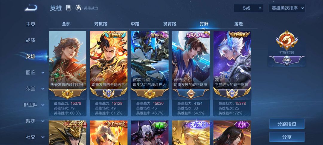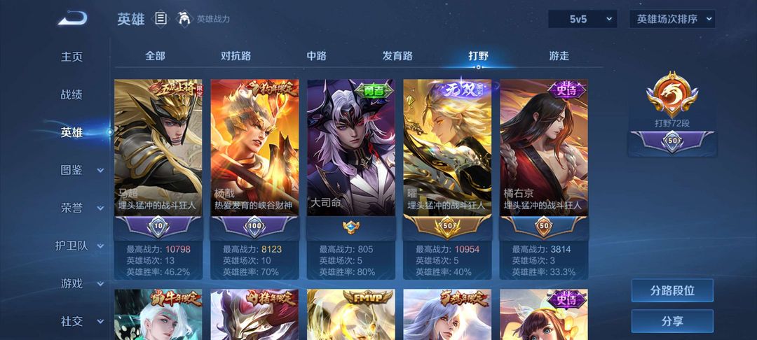 国服在榜带标澜裴擒虎,多款极品对抗打野限定皮肤,可排位可带妹