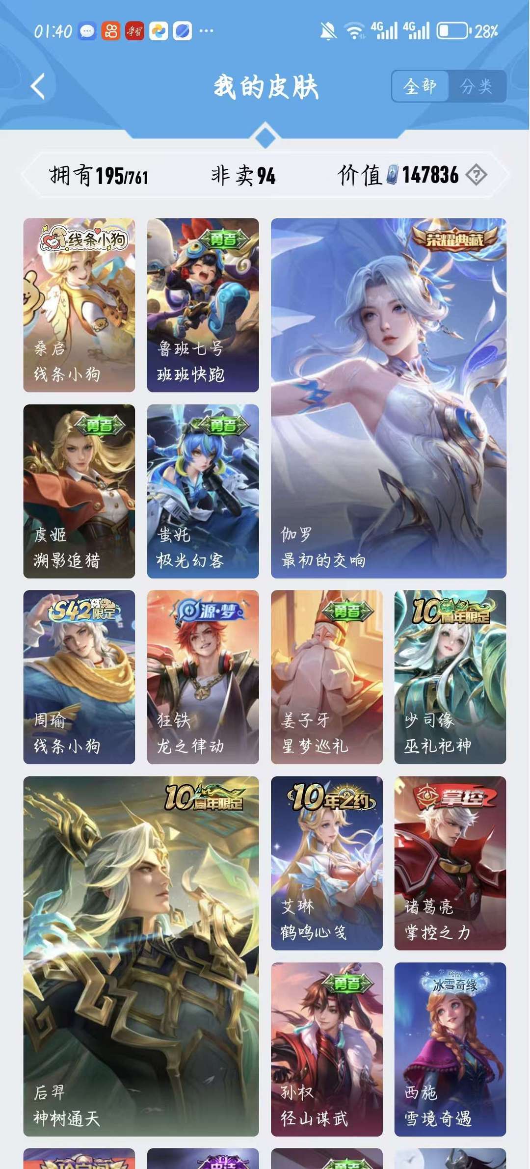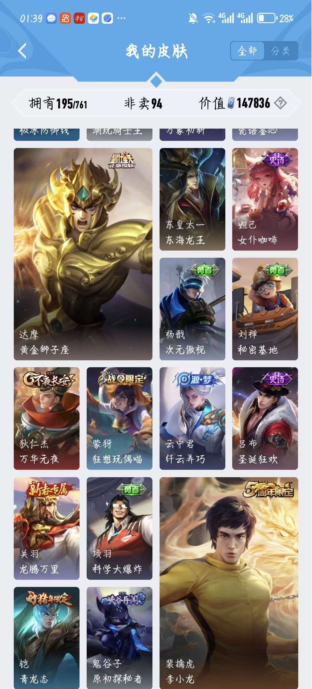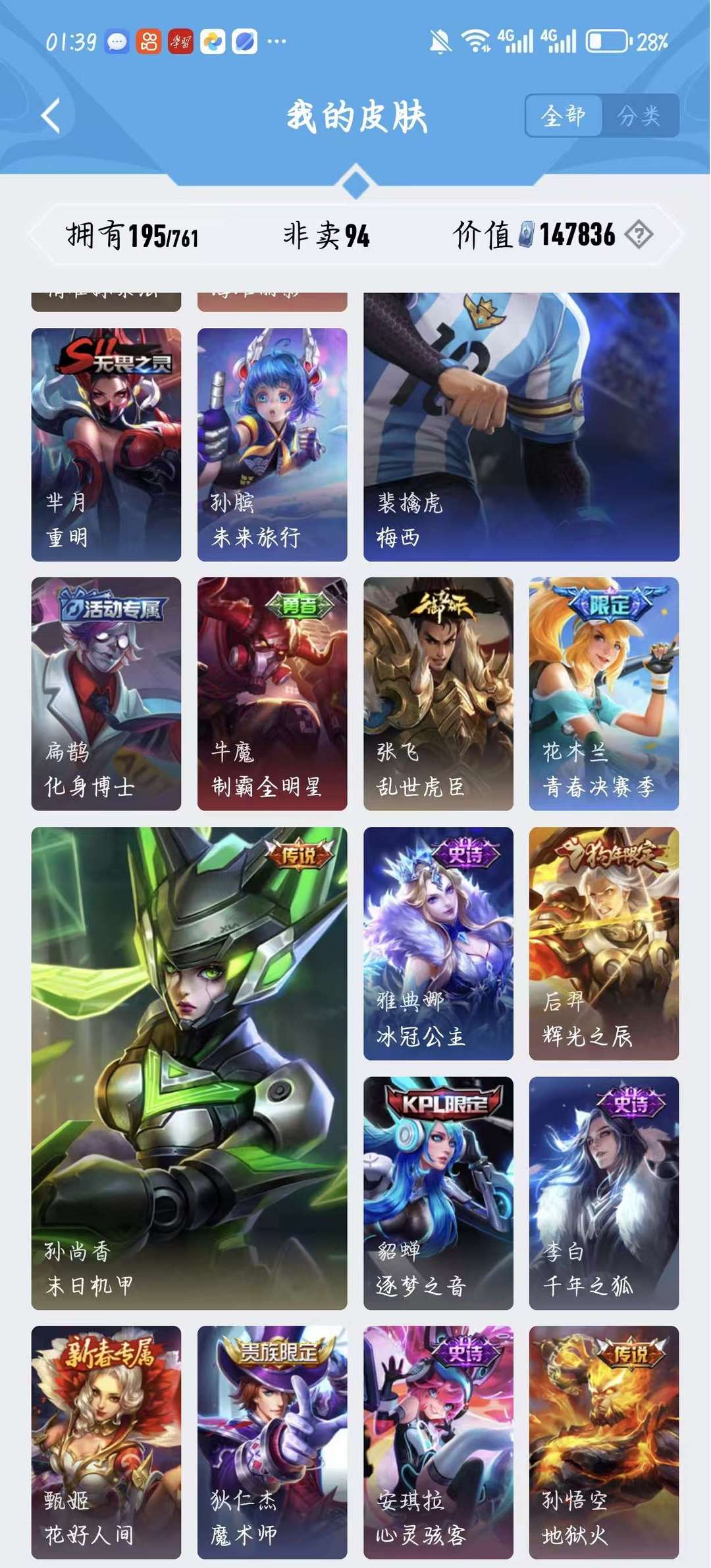 钻石段位可排位,有伽罗的典藏皮肤,有梅西,地狱火,至尊宝,黄金狮子座,末日机甲,等限定皮肤欢迎来玩