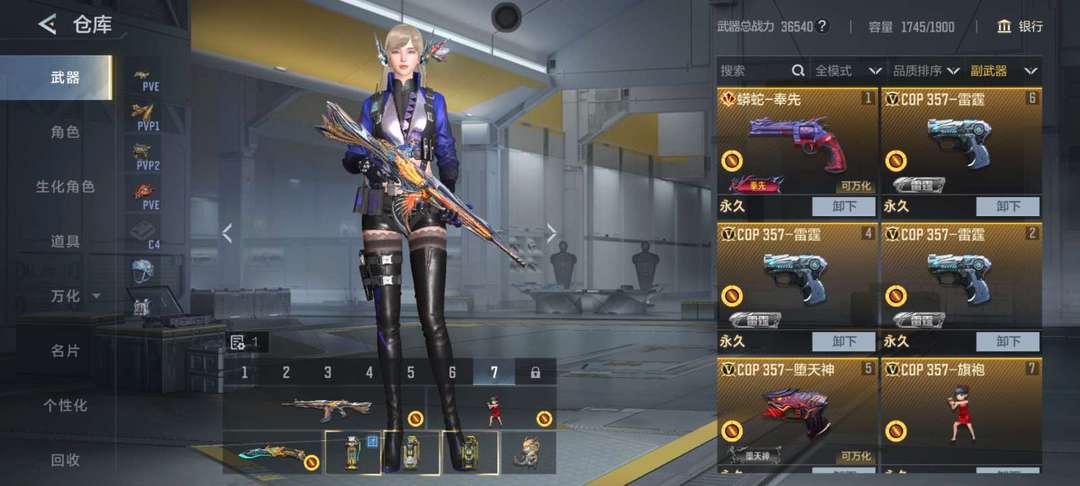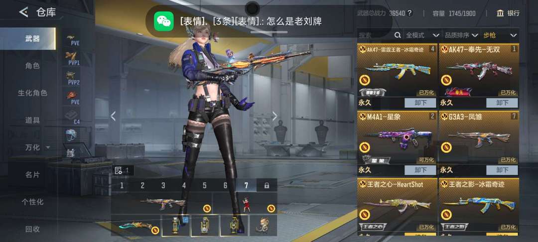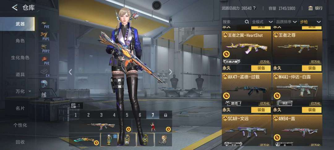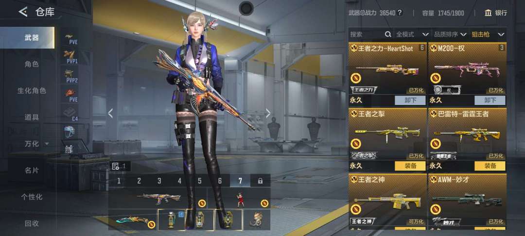 装备描述:一背包的王者武器,巴雷特雷霆王者,AK王者武器都有,生化枪也一堆,竞技奉先星象凤雏等三国武器好几把,两个背包一个爆破一个生化两开花。