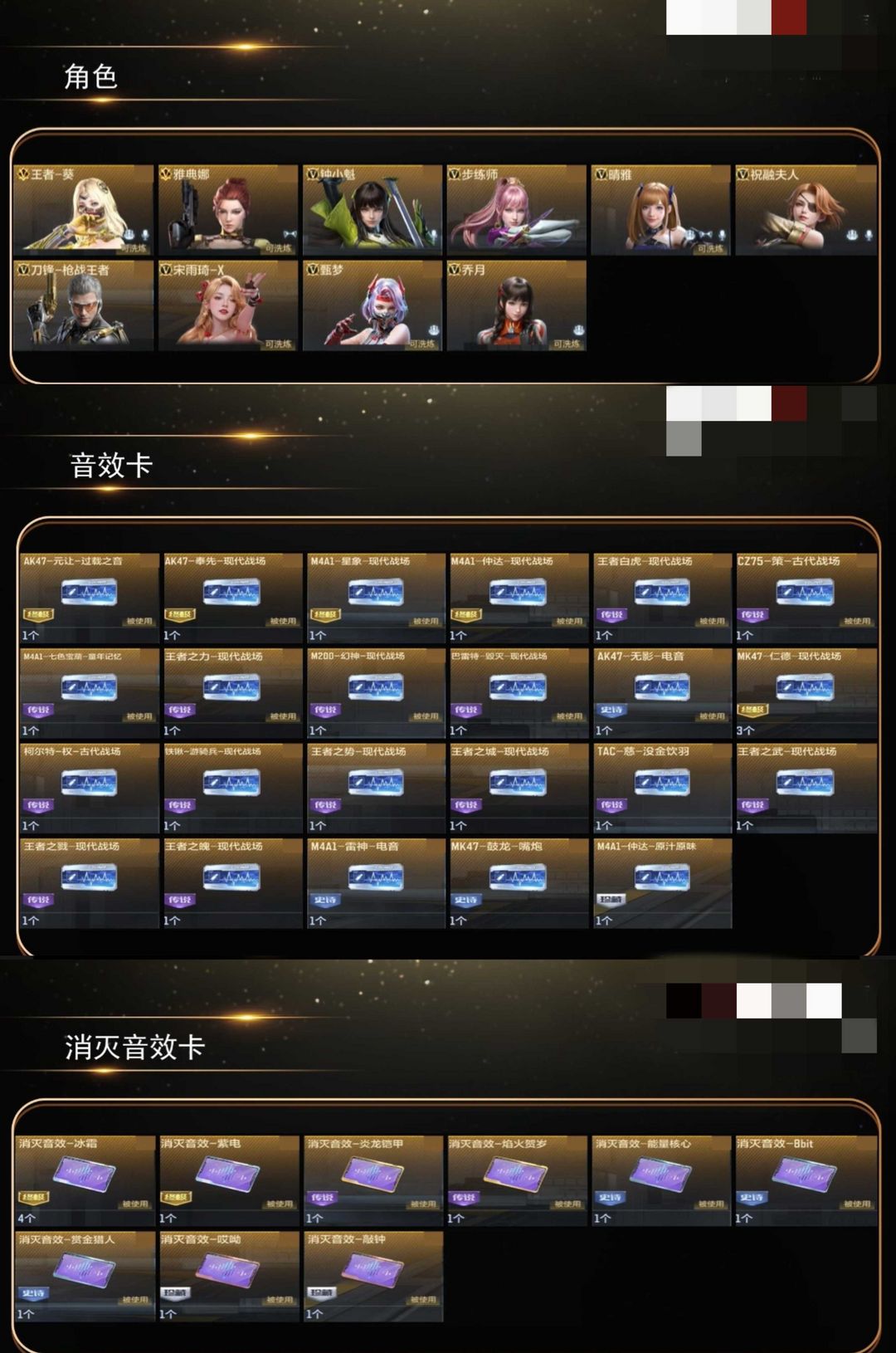 限制: 租号5次及以上 |装备描述:❤️❤️❤️新氪王者白虎❤️❤️❤️ ❤️V10极品❤️星象C4~仁德赢魔C4❤️ ❤️王者葵~钟小葵~晴雅~雅典娜~步练师 ❤️❼把王者之锋-❶紫电王锋~❹把拉丝皮 ❤️王者之力紫电熔岩-带音效卡 ❤️王者之幻步枪-王者之圣-王者之腾-王者蔷薇-王者之势-王者幻神-王者之力-王者之技-王者之竟-王者之翎-M4雷霆王者-巴雷特雷霆王者-王者之翼 ❤️M200权-江东骸虎~本初~仲达白露~元让~孟德绝影➕过载~奉先无双~仁德赢魔~定军~星象四圣 ❤️❷冰霜最终消灭 ❤️一线音效卡齐全,消灭音效和枪线很多 ❤️黑龙魂-本初套装-王蝶-宙斯-巴雷特雷霆王者