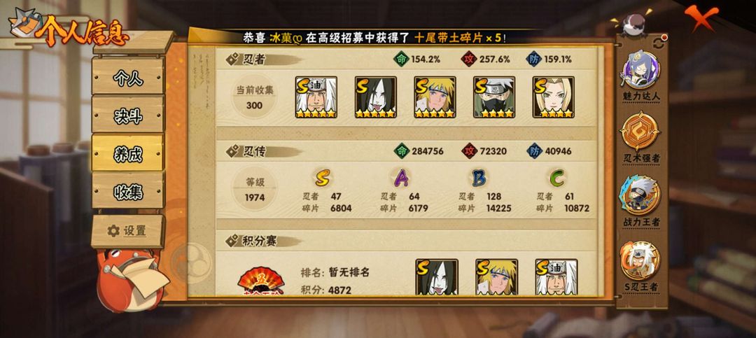 限制: 撤单率<10%才可租用此帐号装备描述:1.忍者300个,47S,64A,晓创生迪达拉,黑绝,十尾带土,仙人巳月,九尾链接水门,秽土再不斩,传说自来也,百战鼬,大筒木舍人,绯流琥歇,须佐卡卡西,破面带土,须佐止水,百战佩恩,天道超,断臂雷,忍战李,大筒木桃式,不风,不缘,秽土解班,桃式显现博人,忍战宁次,长十郎,永恒万花筒佐助,黄猿,红夜带土,百战水门/大筒木金氏/忍战大野木/青水/须佐助 2.战力2700万,可以带团本,忍战修罗 3.通灵有熊猫,蛞蝓,一尾,反打能力极强 4.常规皮肤,场景,站街,酷炫 5.段位赛不计较胜率,快乐就完事了 6.火之意志,生生不息,加入我的羁绊 7.严禁开挂。