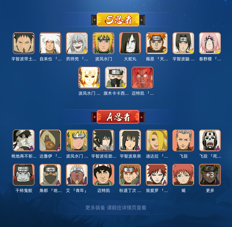 装备描述:全新S须佐卡卡西已秒,忍战樱迈特凯死门,忍战带土,大蛇丸,川剧自来也,波风水门青年,药师兜仙人模式,抢先体验!!!!!!