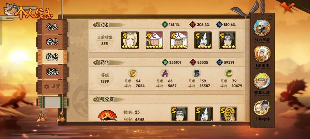 装备描述:355忍 全忍法帖高招 三个初代 四个宇智波斑 死活二代火影 百豪纲手 白面具 罗沙 百豪樱 秽土迪达拉 青年长门 鹰佐骨架 金鸣仙鸣 三代四代雷影