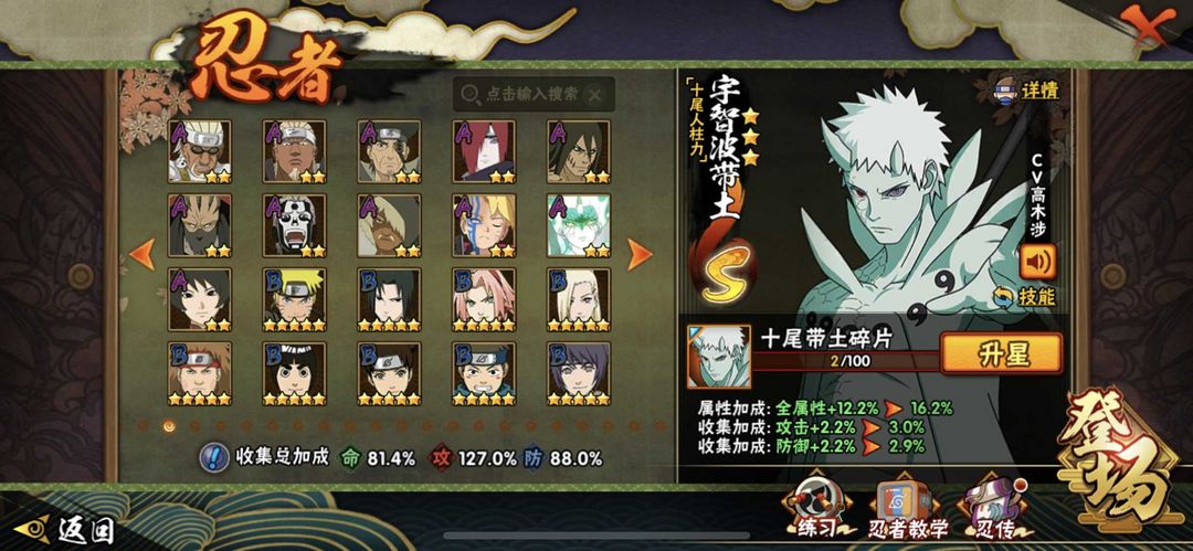 装备描述:漩涡鸣人 「九喇嘛连结」;大蛇丸;猿飞日斩;迈特凯 「死门」;宇智波鼬 「秽土转生」;自来也;千手柱间 「秽土转生」;艾 「忍界大战」;自来也 「仙人模式」;自来也 「
