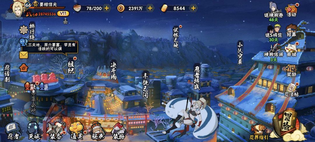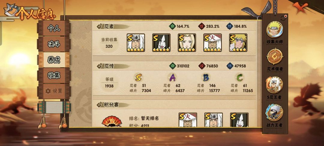 装备描述:忍者320➕S忍者46S✨ 天道·超 ✨忍战带土 ✨斑·白面具 ✨秽土三代✨ 秽土·波风水门 ✨三代目.雷影✨ 百豪纲手 百豪樱 ✨宇智波佐助须佐能乎✨.佩恩天道 ✨战力2870万➕通灵兽22秘卷47