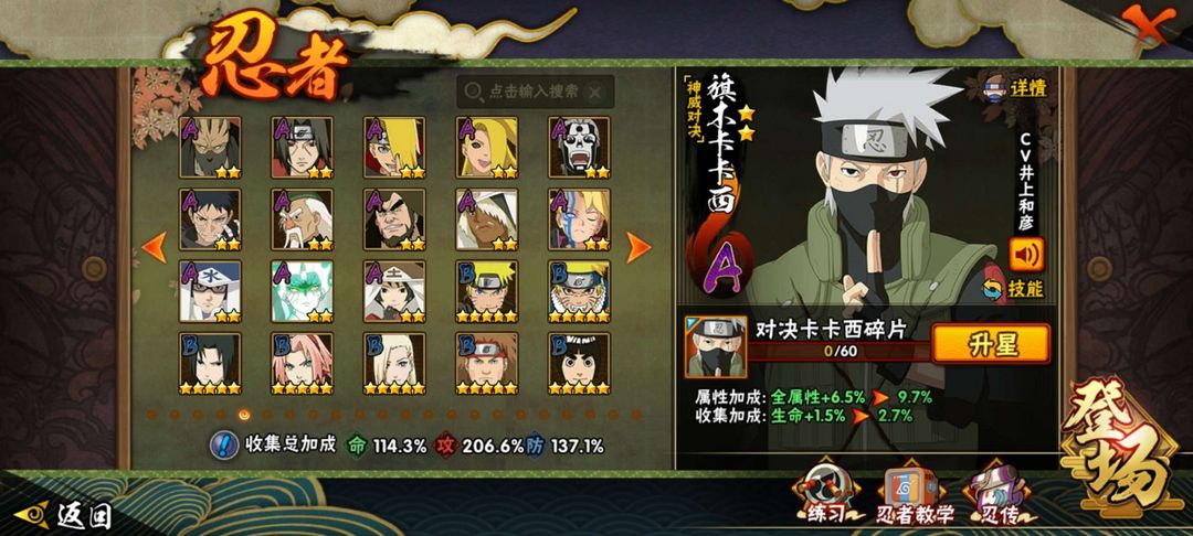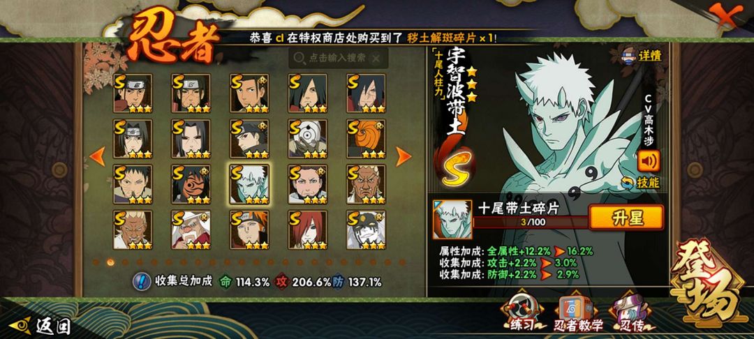 装备描述:2000多w战力,41s,有最新S忍十尾人柱力带土,漂泊带土,漂泊佩恩,4w抗魔值,可跨级带出大多数饰品,可带多数团本如110,130,140团本,有多数版本强势忍者及a忍3废皮肤,轻松暴打好友。