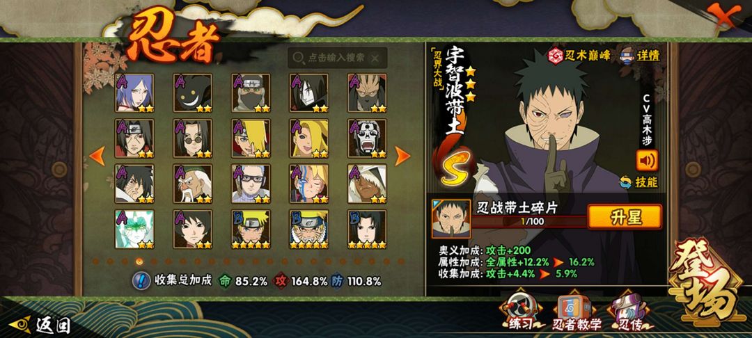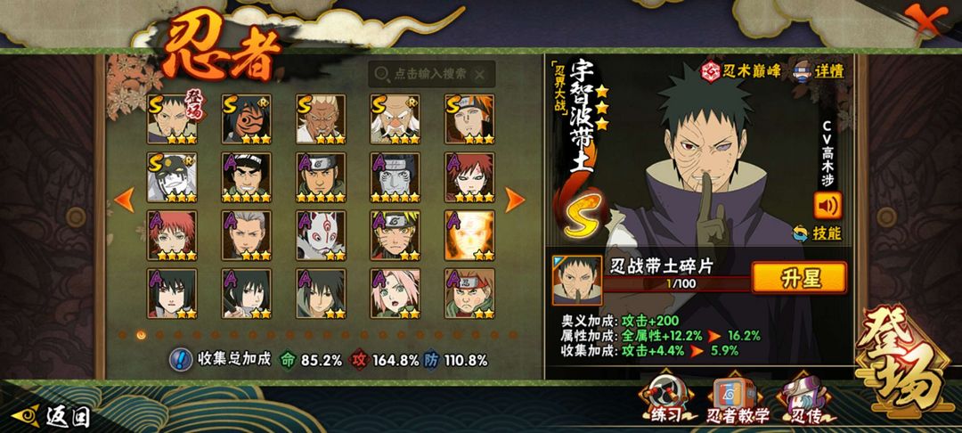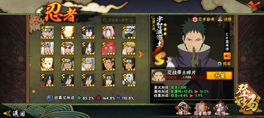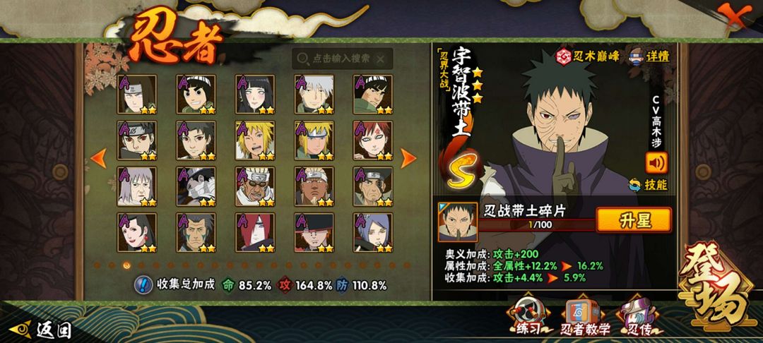装备描述:忍战带土/死门凯:白面具/解斑/红叶面具男/九喇嘛鸣人……