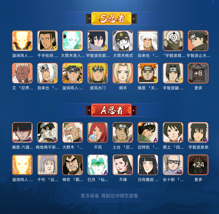 装备描述:大筒木桃式,大筒木舍人,大筒木金式,白面具,须佐卡卡西,须佐佐助,须佐卡卡西,忍战樱,九喇嘛鸣人,九喇嘛水门,盾狗,漂泊小楠,漂泊带土等众多忍者