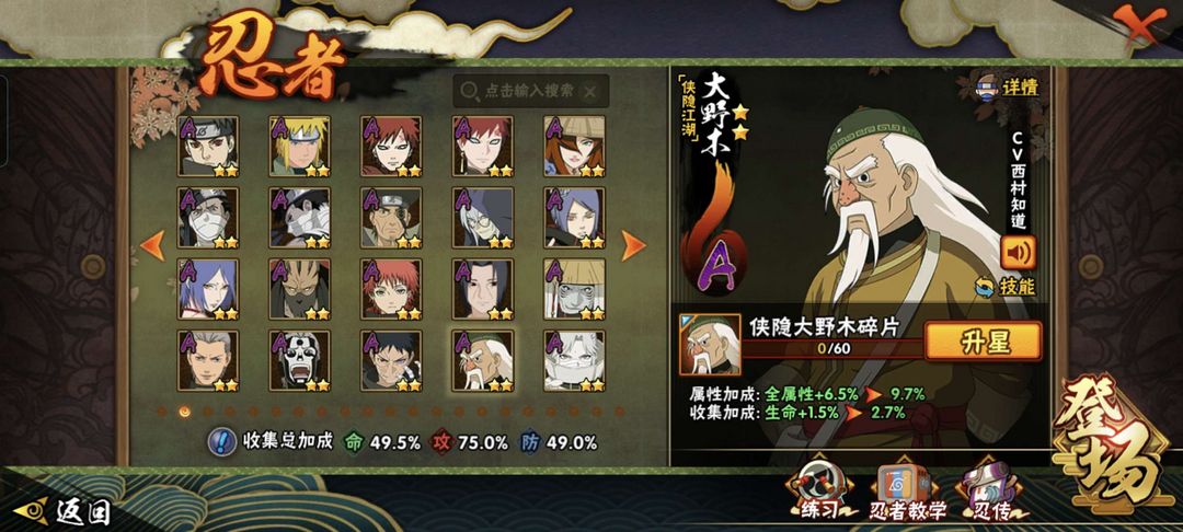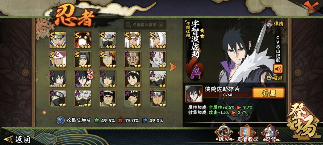 装备描述:六尾鸣人,须佐卡,传说自来也,侠佐,大野木,漂带和小南,夏日鼬,卑留呼,忍战卡,面麻,新春我爱罗,侠照,侠兜,泳卡等,还有许多高招