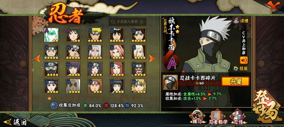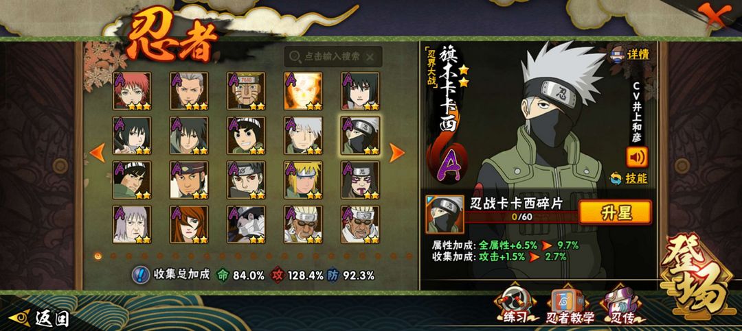装备描述:16S,46A,209忍,忍战带土,仙人兜,解斑,漂泊带土,熊猫,蛞蝓,侠隐兜,七夕阿斯玛,长门,新春鼬,须佐卡卡西,忍战卡卡西