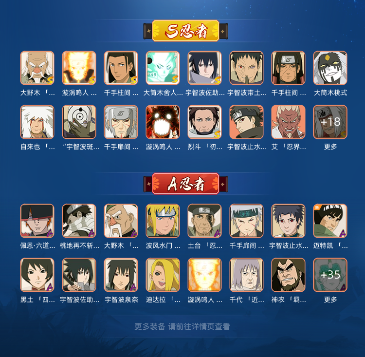 装备描述:九喇嘛鸣人 五影带土 永恒佐助 漂泊佩恩 秽土柱间 秽土解班 舍人 须佐止水 秽土三代 舍人多个热门忍者