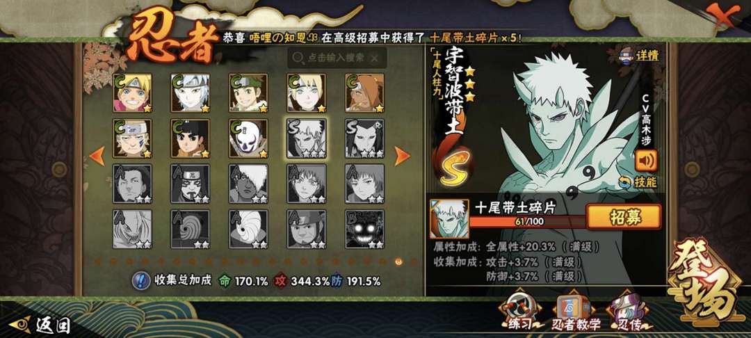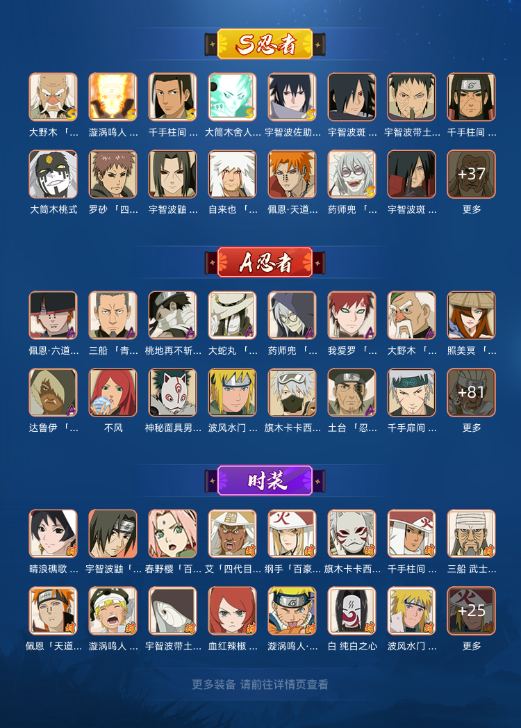 装备描述:黑绝,忍战带土,虎皮,白面具,红夜面具男,死班活班,死柱,死二,外星人,土影无,半藏,