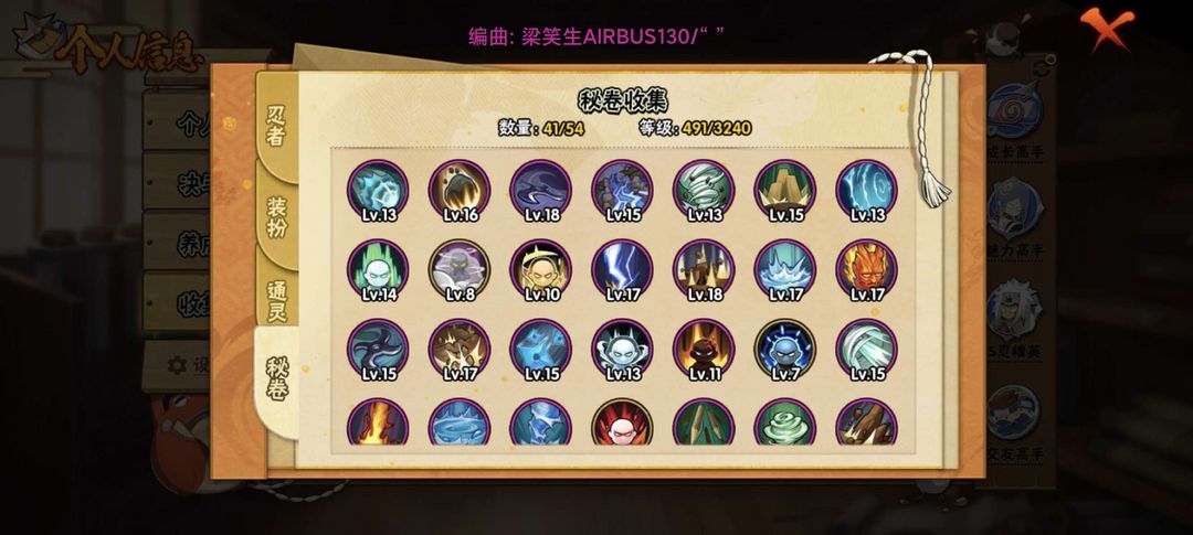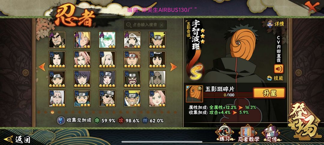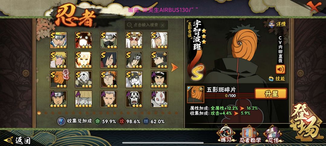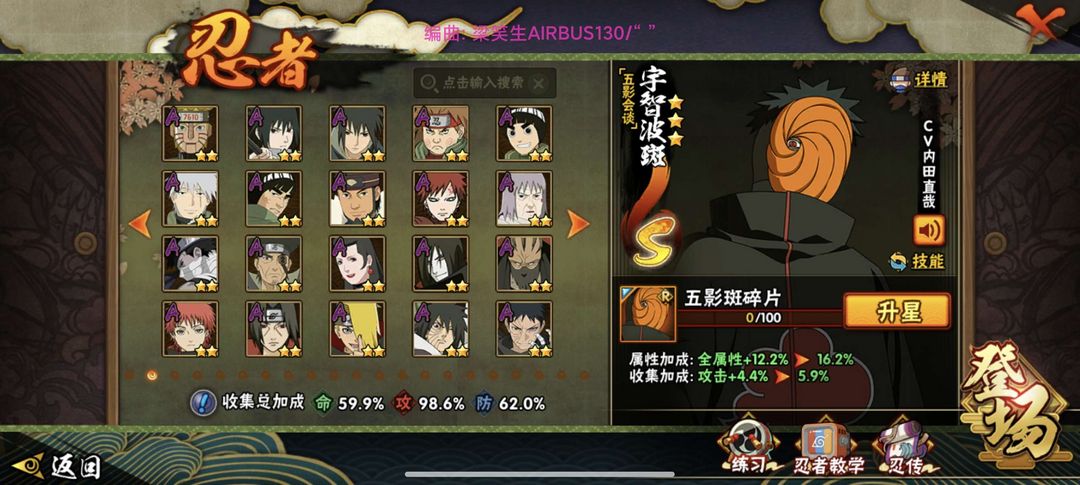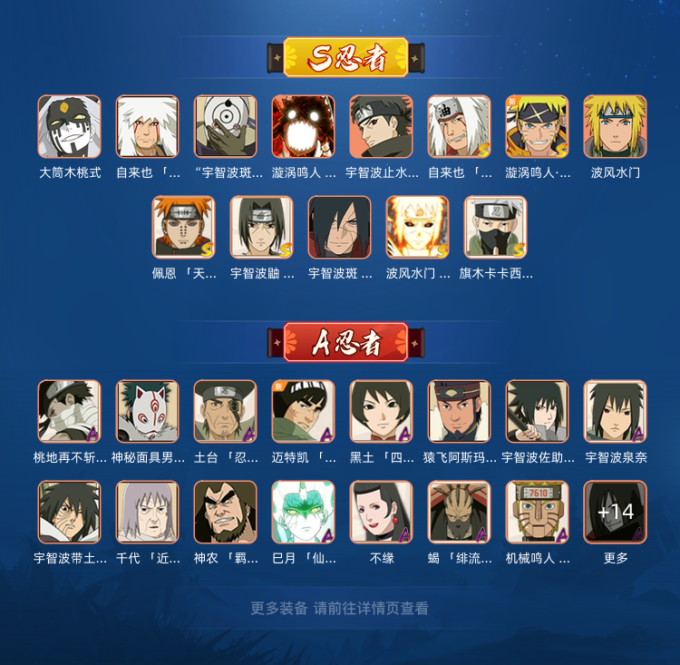 装备描述:高招 须佐卡卡西 解斑 桃博 白面具 九尾水门 三忍自来也 骨架 忍战李 蝎 忍法帖 神农 机械鸣人 六尾鸣人 五影班 须佐止水 大筒木桃式