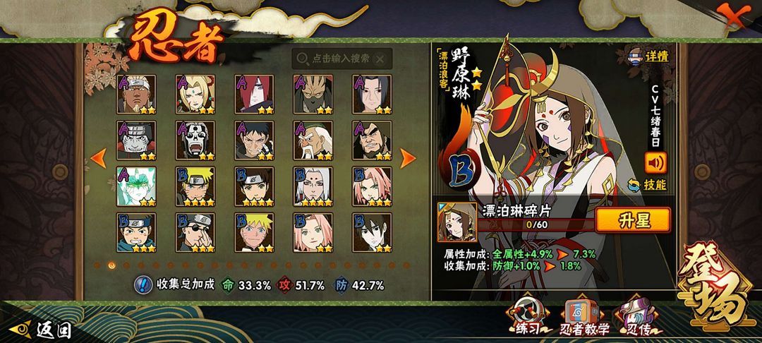 装备描述:8S✨23✨103忍✨漂泊带土✨金身水门✨传说自来也✨仙人巳月✨泳装鼬✨青年艾✨青年水门