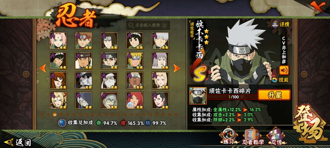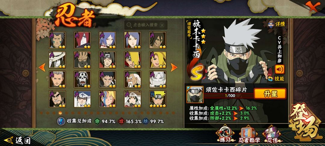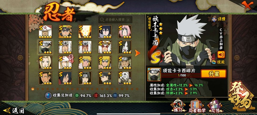 装备描述:漂泊带土,卑留呼,新春小南,漂泊小南白面具,须佐卡,仙人兜,五影带土,破面带土,红夜带土,忍战雷影,九喇嘛鸣人,忍战樱,死水,永恒佐助,死三代,创立柱间,须佐止水,大筒木桃式,大筒木金式,鸡翅佐助,百豪樱,侠隐兜,漂泊再不斩,妖怪纲手,秽土再不斩,新春大蛇丸,七夕阿斯玛,万蛇,新春万蛇等。