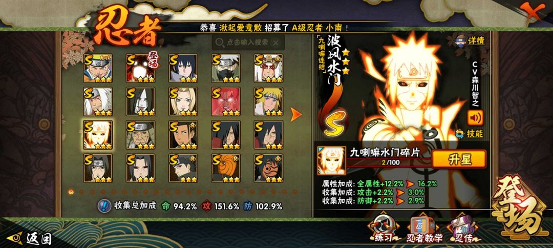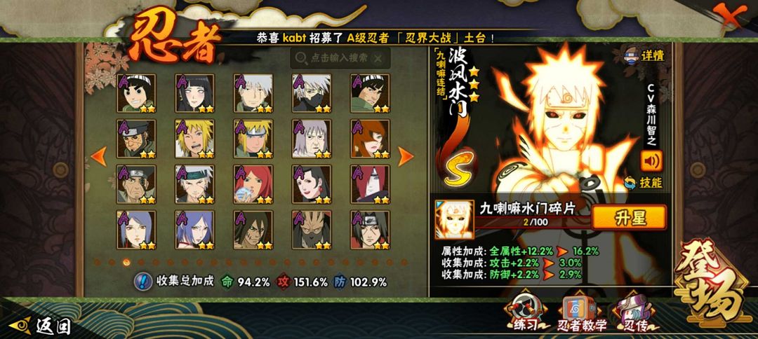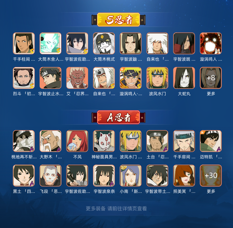 装备描述:秽土鼬,忍界大战艾,九喇嘛连结波风水门,六尾鸣人等等,A有漂泊带土,新春小南等一些热门忍者。