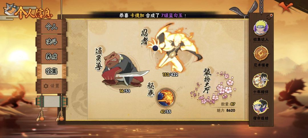 装备描述:六道佩恩 九喇嘛水门 传说三忍自来也 秽土转生解斑 忍战带土 七夕阿斯玛 夏日鼬 须佐卡卡西 等等