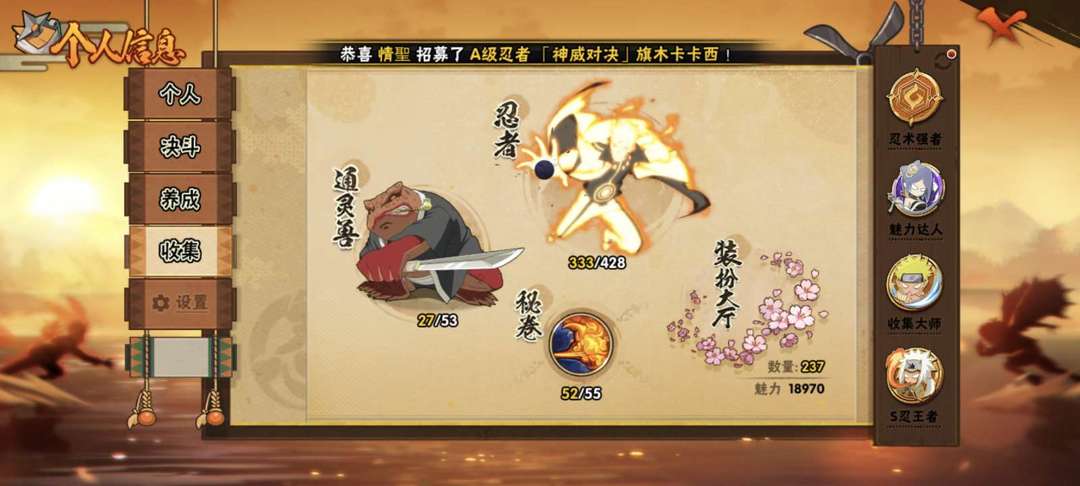 有333个忍者41个s198大部分都有98通灵有熊猫,螃蟹,六尾。A忍有84个,C忍全都有