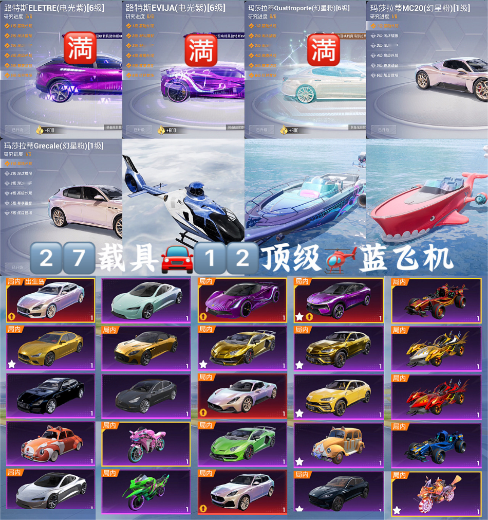 3满级车⭐119粉46枪30车⭐满级宾利⭐满级迈凯伦⭐3色螳螂⭐满升级车⭐木乃伊⭐12顶级⭐满级特效