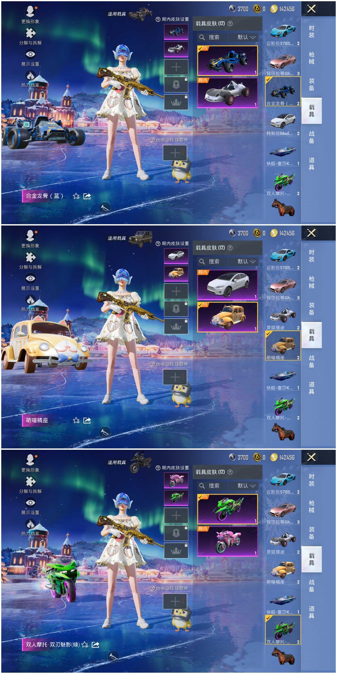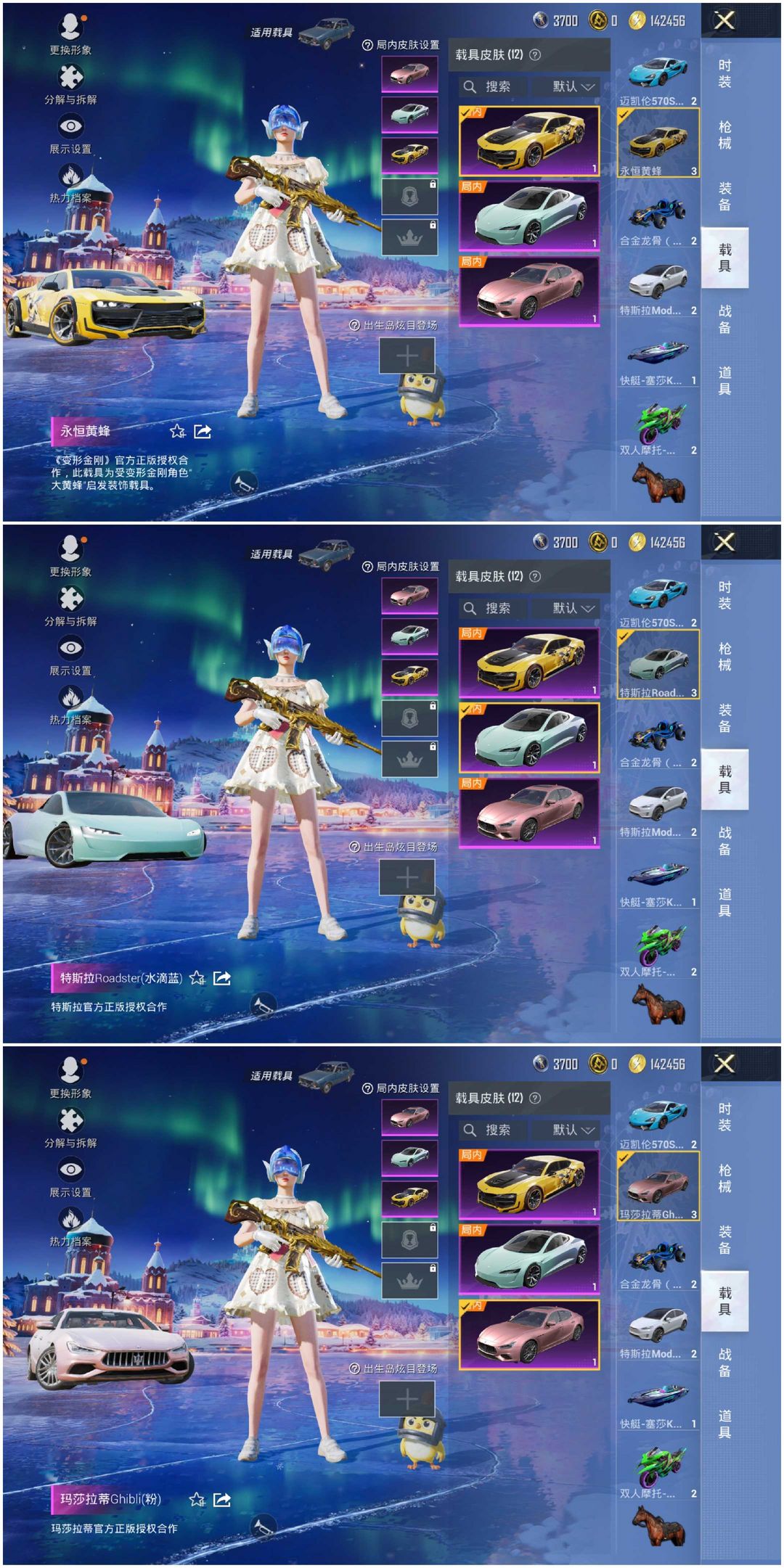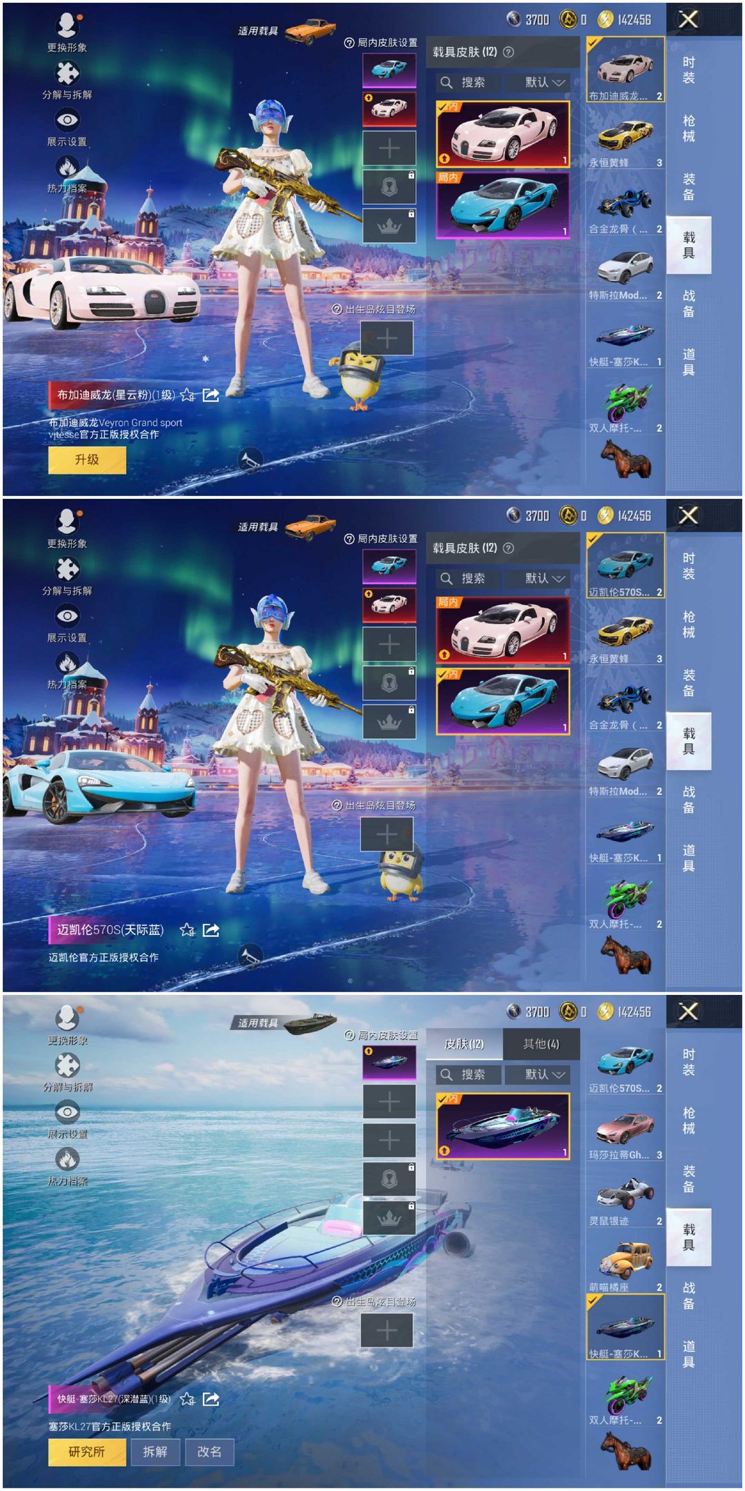 ⛔速玩·①②载具⛔〖三币红车❤粉色布加迪威龙〗⑧粉装⑤特效枪③飞行器✨火箭少女✨塞莎快艇✨玛莎拉蒂