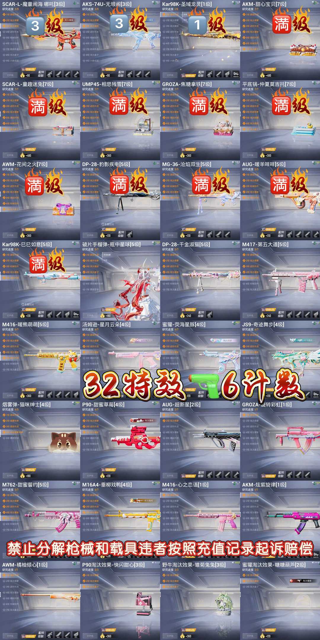 限制: 租号12次及以上 | 撤单率<60%才可租用此帐号装备描述:特别声明!!!! 分解枪械永久拉黑不解除 【乱投诉拉黑】有问题/上不去/其他问题/ 特殊需求/投诉没用等问题 账号累计充值超15万!切勿开挂/分解装备/恶意骂人/等等违规行为,发现违规必追查到底(平台登录记录,游戏登录ip手机号 设备串号 充值付款记录不要侥幸现在网警都能调到你的所有行为记录就算盗用他人信息也一样能查到你头上)按账号充值金额=起诉/刑事立案/追责赔偿! 非速玩【非云!本机设备畅玩不卡顿】