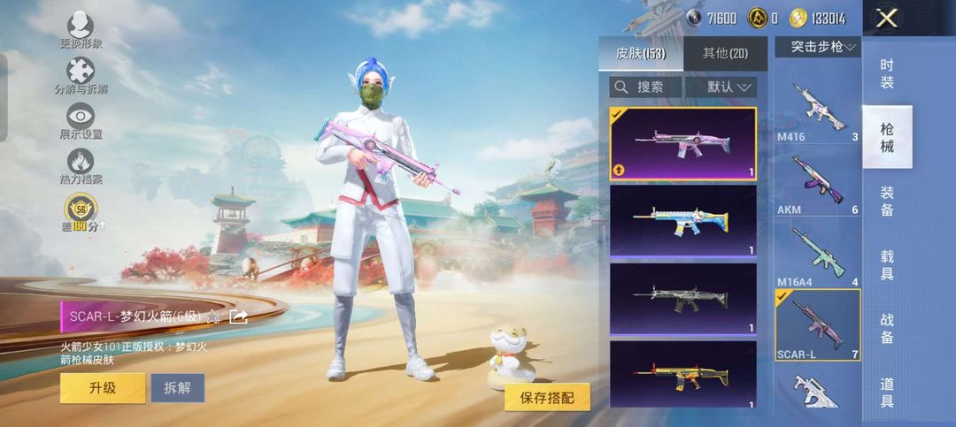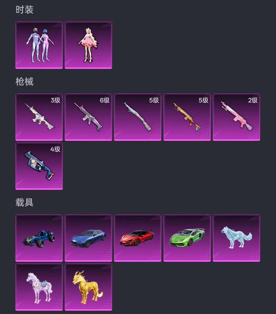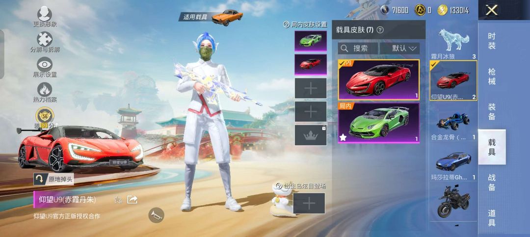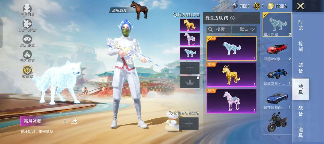 装备描述:霜月冰狼全套/仰望U9/兰博基尼/合金龙骨/晶梦灵驹/护士瑞兽/玛莎拉蒂/梦幻火箭/M416天马/SCARL梦幻火箭等皮肤