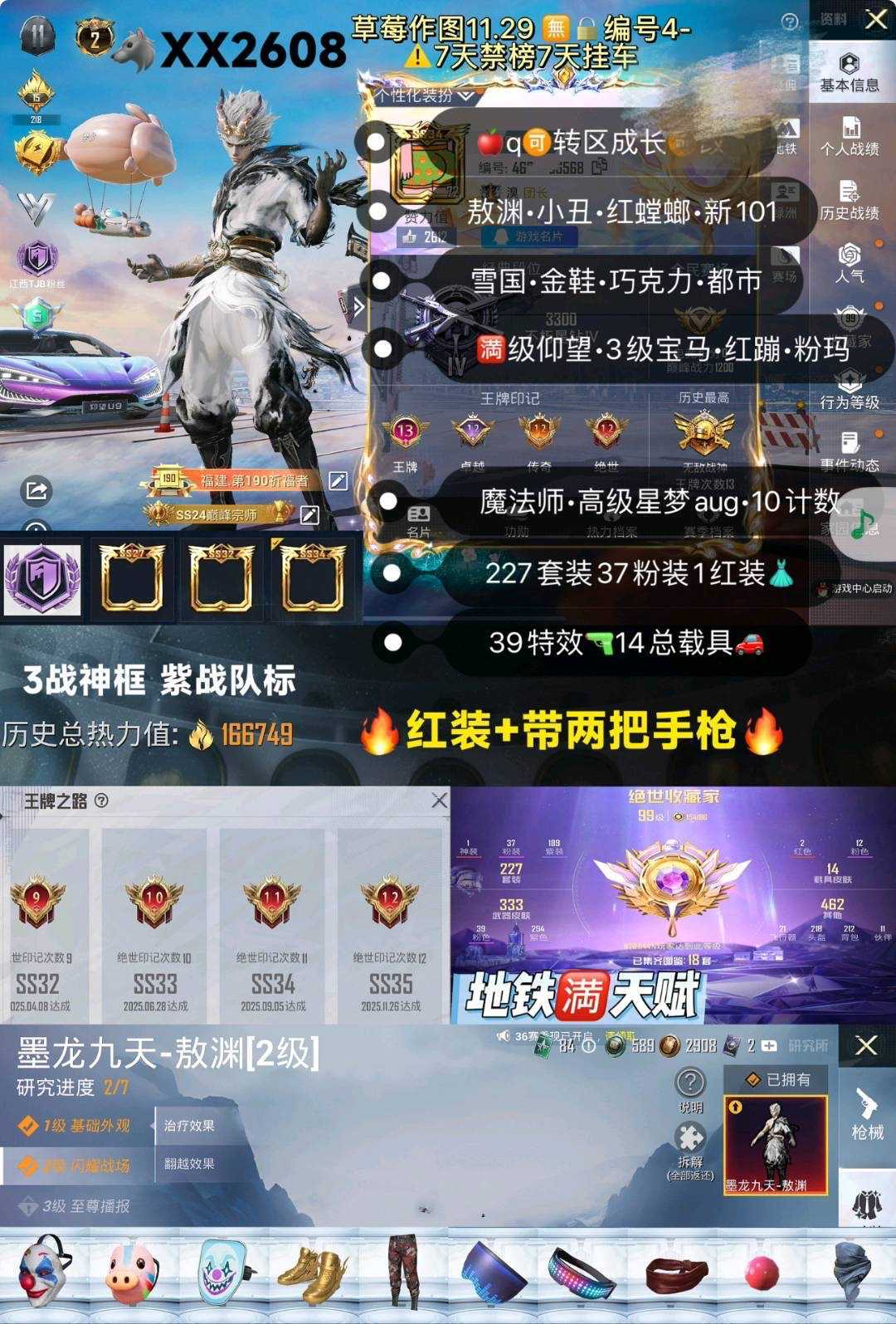 限制: 租号5次及以上 | 撤单率<40%才可租用此帐号装备描述:毁号,涉及毁坏虚拟财产罪及计算机安全罪,请文明游戏素质游戏,让我们共建美好租号平台 【特别事项】 红装可任意分解升级所需要满级的红装 禁止分解枪械载具,违者拉黑起诉赔偿 非账号问题撤单的全部永久拉黑 A.游戏过程中请不要恶意挂机或者不文明发言 B.恶意挂机、顶号等行为将被拉黑无法再次下单 C.进入游戏后中途请勿退出登陆,否则无法再次上号 D.部分账号由于异地登录可能会出现密码错误提示,通常再尝试5-6次后可上号 喜欢本账号请点 ☆收藏☆ 方便下次租用,谢谢光临惠顾