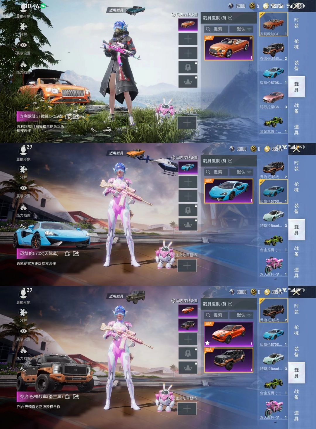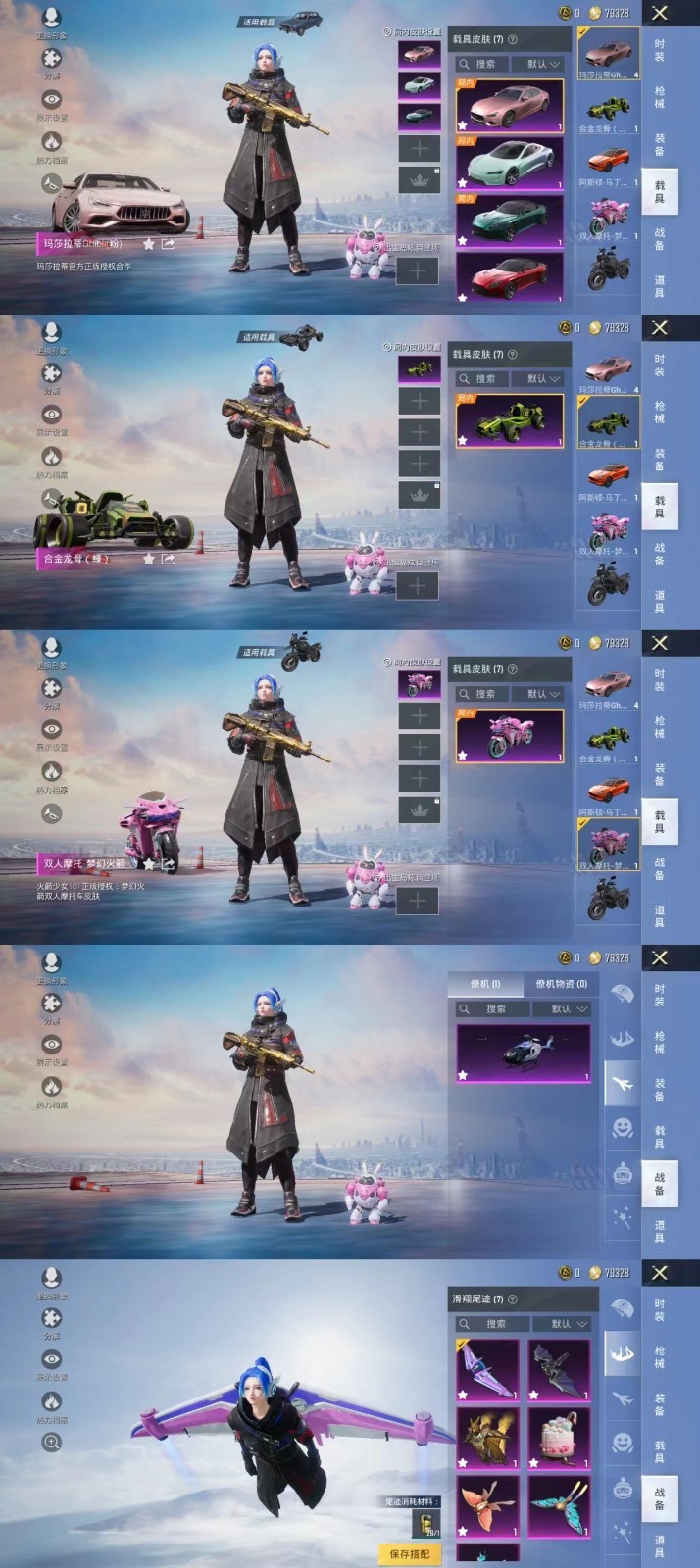 限制: 租号5次及以上 | 撤单率<50.00%才可租用此帐号装备描述:非速玩微区10载具宾利欧陆乔治巴顿战车迈凯伦粉玛莎合金龙骨⭐6特效枪五爪金龙18粉装童趣迷兔火箭少女